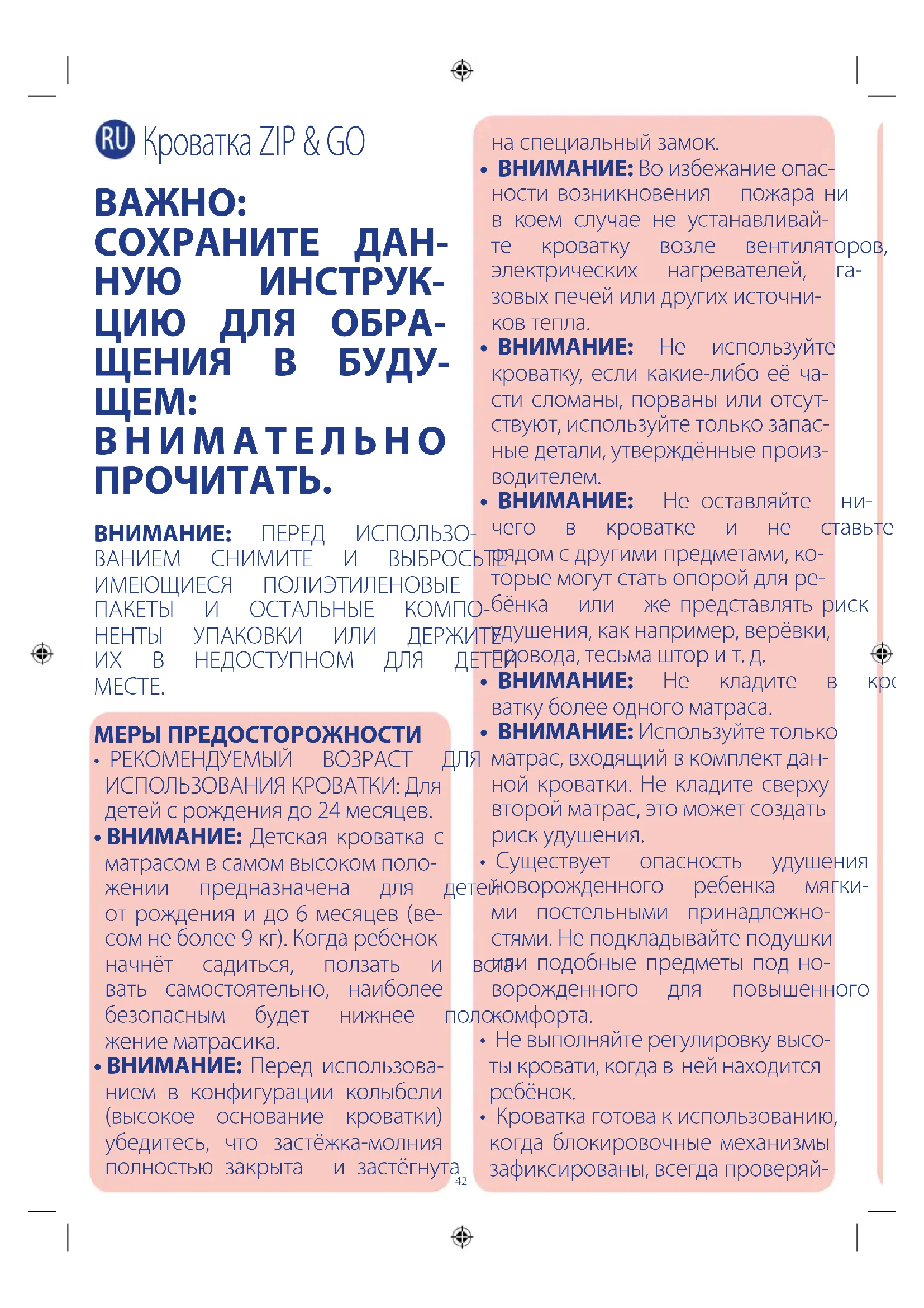 Скачайте инструкцию для вашего детская кроватка в формате PDF бесплатно! Найдите своё руководство Zip & Go - CHICCO и возьмите своё электронное устройство обратно в руки. На этой странице опубликованы все документы, необходимые для использования вашего устройства. Zip & Go бренда CHICCO.