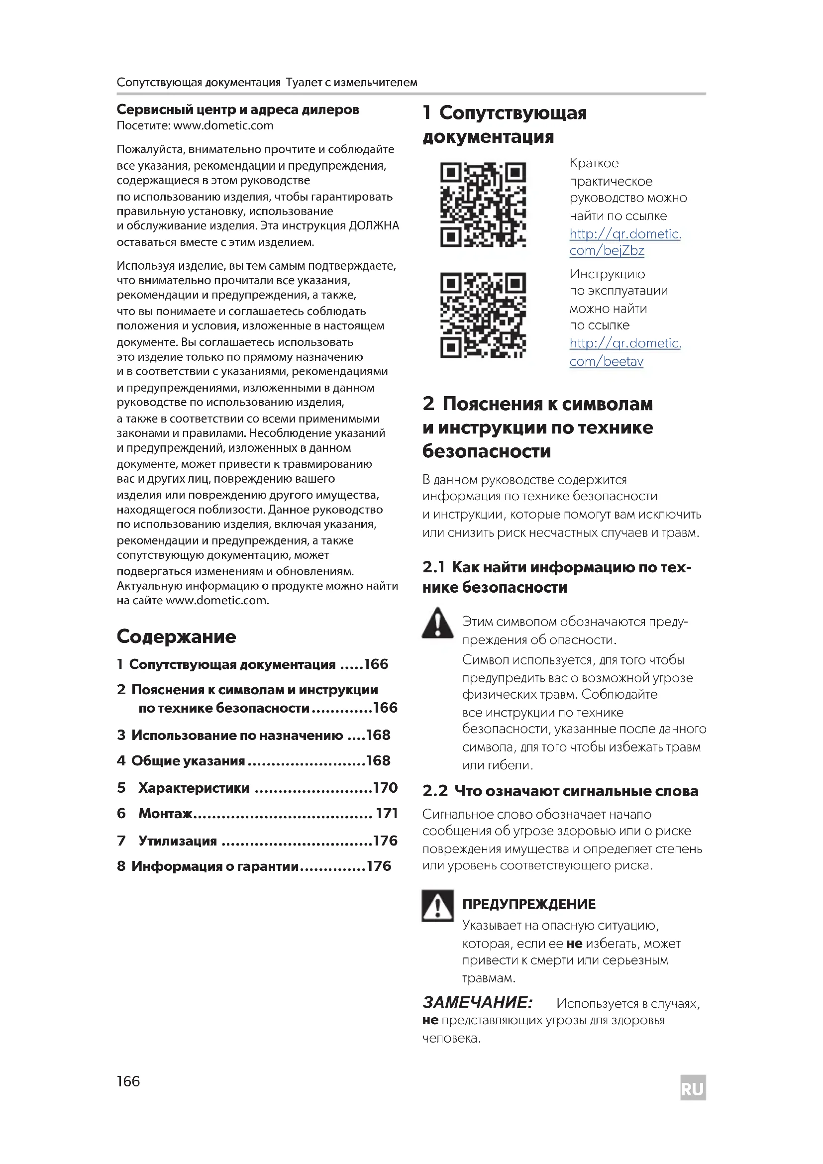 http://qr.dometic. com/beetav 2 Пояснения ксимволам иинструкции потехнике безопасности Вданном руководстве содержится информация потехнике безопасности иинструкции, которые помогут вам исключить илиснизить риск несчастных случаев итравм.