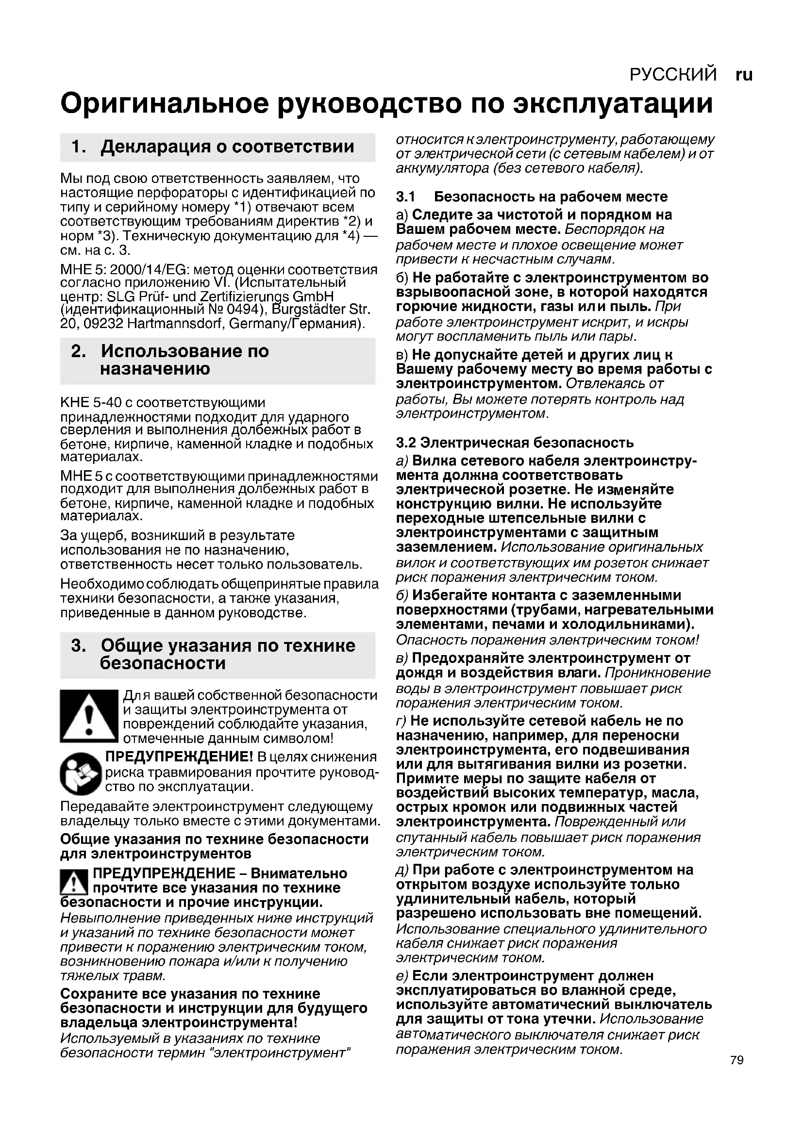 Оригинальное руководство по эксплуатации Мы под свою ответственность заявляем, что настоящие перфораторы с идентификацией по типу и серийному номеру *1) отвечают всем соответствующим требованиям директив *2) и норм *3). Техническую документацию для *4) — см. на с. 3. MHE 5: 2000/14/EG: метод оценки соответствия согласно приложению VI. (Испытательный центр: SLG Prüf- und Zertifizierungs GmbH (идентификационный № 0494), Burgstädter Str. 20, 09232 Hartmannsdorf, Germany/Германия). KHE 5-40 с соответствующими принадлежностями подходит для ударного сверления и выполнения долбежных работ в