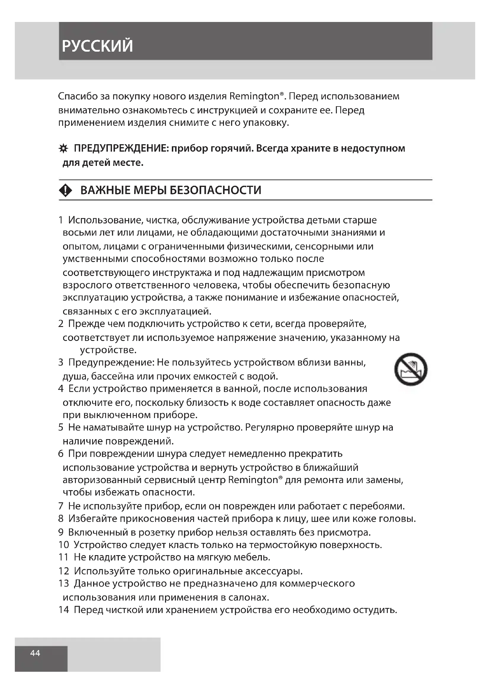 Az elektromos és elektronikus termékekben jelen lévő veszélyes anyagok jelentette környezeti és egészségi kockázatok elkerülése érdekében az ilyen jelöléssel ellátott készülékeket tilos a háztartási hulladékkal együtt megsemmisíteni, gondoskodni kell azok újrahasznosításáról. MAGYAR GBDNLFEIDKSFINPSKCZ HUN PLRUTRROGRSI AE HR UA44 Спасибо за покупку нового изделия Remington®. Перед использованием внимательно ознакомьтесь с инструкцией и сохраните ее. Перед применением изделия снимите с него упаковку. , ПРЕДУПРЕЖДЕНИЕ: прибор горячий. Всегда храните в недоступном для детей месте. F ВАЖНЫЕ МЕРЫ БЕЗОПАСНОСТИ 1 Использование, чистка, обслуживание устройства детьми старше восьми лет или лицами, не обладающими достаточными знаниями и опытом, лицами с ограниченными физическими, сенсорными или умственными способностями возможно только после соответствующего инструктажа и под надлежащим присмотром взрослого ответственного человека, чтобы обеспечить безопасную эксплуатацию устройства, а также понимание и избежание опасностей, связанных с его эксплуатацией. 2 Прежде чем подключить устройство к сети, всегда проверяйте, соответствует ли используемое напряжение значению, указанному на устройстве. 3 Предупреждение: Не пользуйтесь устройством вблизи ванны, душа, бассейна или прочих емкостей с водой. 4 Если устройство применяется в ванной, после использования отключите его, поскольку близость к воде составляет опасность даже при выключенном приборе. 5 Не наматывайте шнур на устройство. Регулярно проверяйте шнур на наличие повреждений. 6 При повреждении шнура следует немедленно прекратить использование устройства и вернуть устройство в ближайший авторизованный сервисный центр Remington® для ремонта или замены, чтобы избежать опасности. 7 Не используйте прибор, если он поврежден или работает с перебоями. 8 Избегайте прикосновения частей прибора к лицу, шее или коже головы. 9 Включенный в розетку прибор нельзя оставлять без присмотра. 10 Устройство следует класть только на термостойкую поверхность. 11 Не кладите устройство на мягкую мебель. 12 Используйте только оригинальные аксессуары. 13 Данное устройство не предназначено для коммерческого использования или применения в салонах. 14 Перед чисткой или хранением устройства его необходимо остудить. PУCCKИЙ45 C ОСНОВНЫЕ ХАРАКТЕРИСТИКИ 1 25-мм выдвижные щипцы без зажима 2 Световой индикатор включения 3 Ненагревающийся наконечник 4 Дорожный чехол для хранения (не показан) 5 Термостойкая перчатка — только первичная защита 6 Вращающийся шнур C ХАРАКТЕРИСТИКИ ИЗДЕЛИЯ