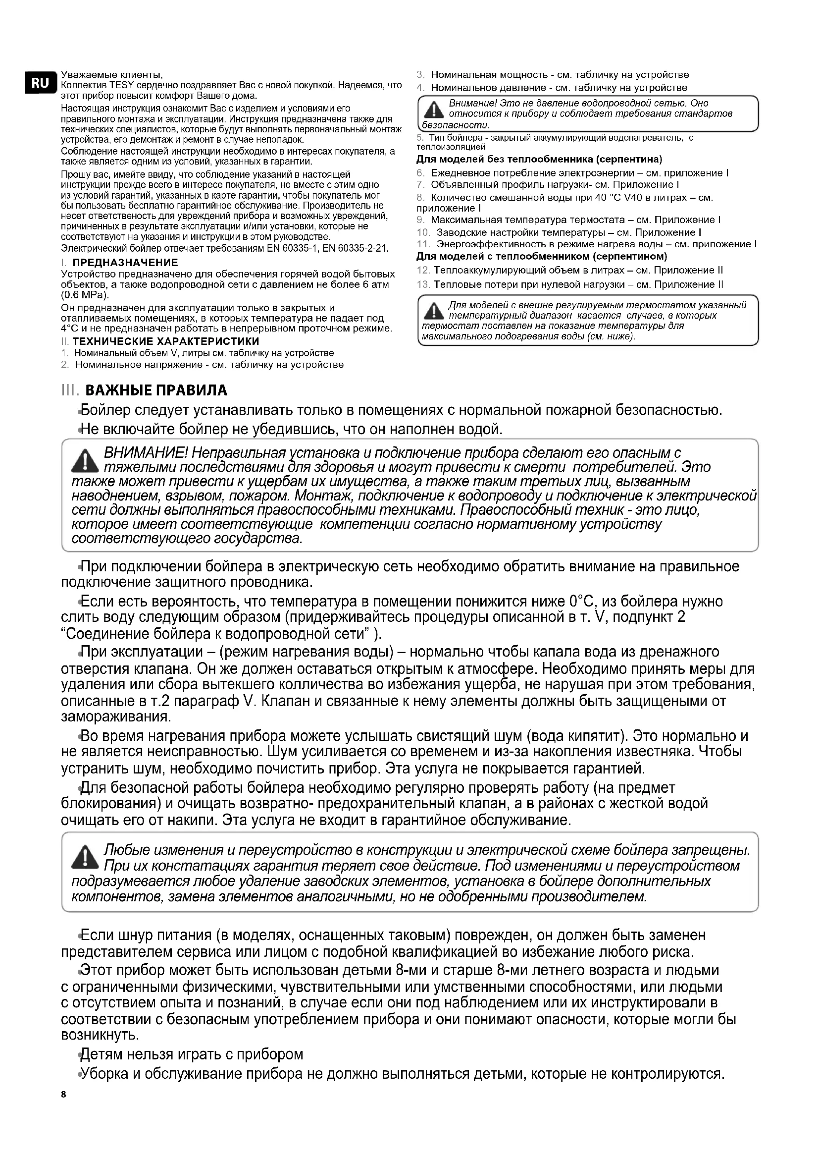 Уважаемые клиенты, Коллектив TESY сердечно поздравляет Вас с новой покупкой. Надеемся, что этот прибор повысит комфорт Вашего дома. Настоящая инструкция ознакомит Вас с изделием и условиями его правильного монтажа и эксплуатации. Инструкция предназначена также для технических специалистов, которые будут выполнять первоначальный монтаж устройства, его демонтаж и ремонт в случае неполадок. Соблюдение настоящей инструкции необходимо в интересах покупателя, а также является одним из условий, указанных в гарантии. Прошу вас, имейте ввиду, что соблюдение указаний в настоящей инструкции прежде всего в интересе покупателя, но вместе с этим одно из условий гарантий, указанных в карте гарантии, чтобы покупатель мог бы пользовать бесплатно гарантийное обслуживание. Производитель не несет ответственость для увреждений прибора и возможных увреждений, причиненных в результате эксплуатации и/или установки, которые не соответствуют на указания и инструкции в этом руководстве. Электрический бойлер отвечает требованиям EN 60335-1, EN 60335-2-21.