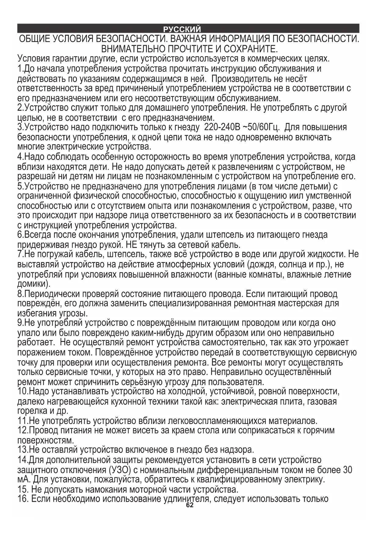 За да се заштитат вашата околина: ве молиме одделни кутии и пластични кеси и да располага со нив во соодветните канти за отпадоци. Користи апаратот треба да биде предаден на посветен собирање поени поради hazarsous компоненти, кои можат да влијаат на животната средина. Не фрлајте овој апарат во заедничката корпа за отпадоци. 61РУССКИЙ Условия гарантии другие, если устройство используется в коммерческих целях. ОБЩИЕ УСЛОВИЯ БЕЗОПАСНОСТИ. ВАЖНАЯ ИНФОРМАЦИЯ ПО БЕЗОПАСНОСТИ. ВНИМАТЕЛЬНО ПРОЧТИТЕ И СОХРАНИТЕ. 14.Для дополнительной защиты рекомендуется установить в сети устройство защитного отключения (УЗО) с номинальным дифференциальным током не более 30 мА. Для установки, пожалуйста, обратитесь к квалифицированному электрику. 8.Периодически проверяй состояние питающего провода. Если питающий провод повреждён, его должна заменить специализированная ремонтная мастерская для избегания угрозы. 5.Устройство не предназначено для употребления лицами (в том числе детьми) с ограниченной физической способностью, способностью к ощущению иил умственной способностью или с отсутствием опыта или познакомления с устройством, разве, что это происходит при надзоре лица ответственного за их безопасность и в соответствии с инструкцией употребления устройства. 6.Всегда после окончания употребления, удали штепсель из питающего гнезда придерживая гнездо рукой. НЕ тянуть за сетевой кабель. 2.Устройство служит только для домашнего употребления. Не употреблять с другой целью, не в соответствии с его предназначением.