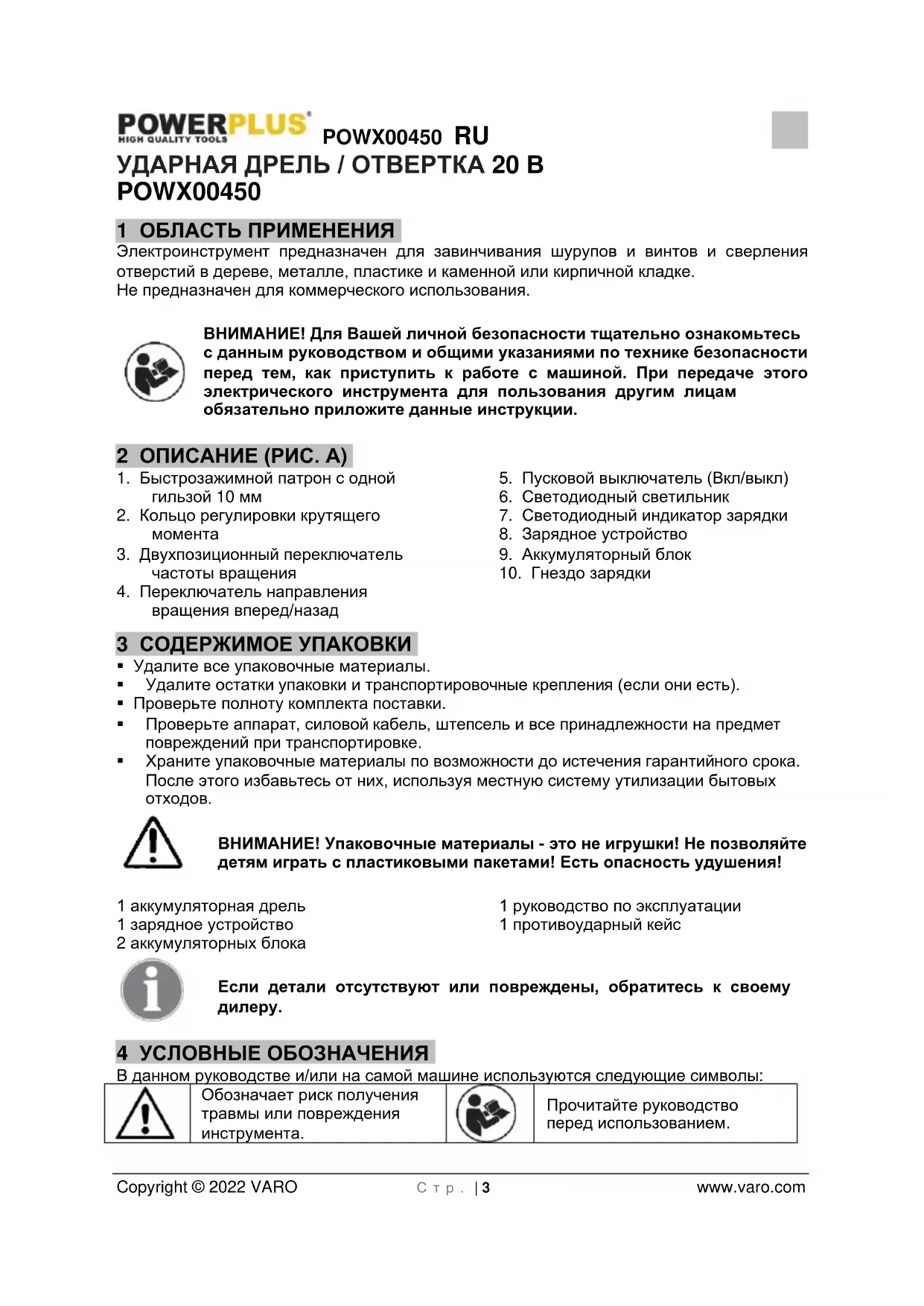 Прочитайте руководство перед использованием.POWX00450 RU Copyright © 2022 VARO С т р . | 4 www.varo.com