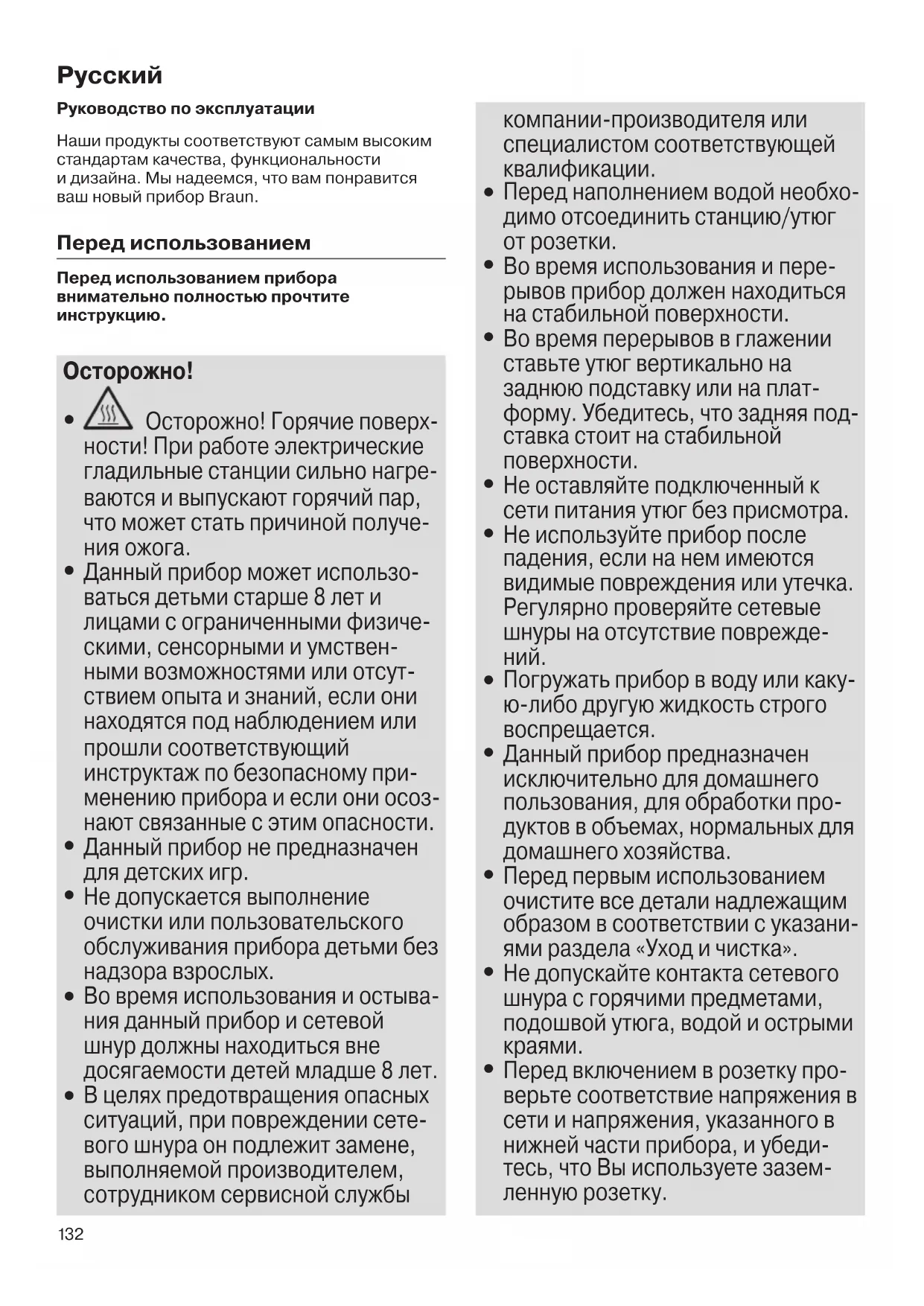 Осторожно! Горячие поверх- ности! При работе электрические гладильные станции сильно нагре- ваются и выпускают горячий пар, что может стать причиной получе-