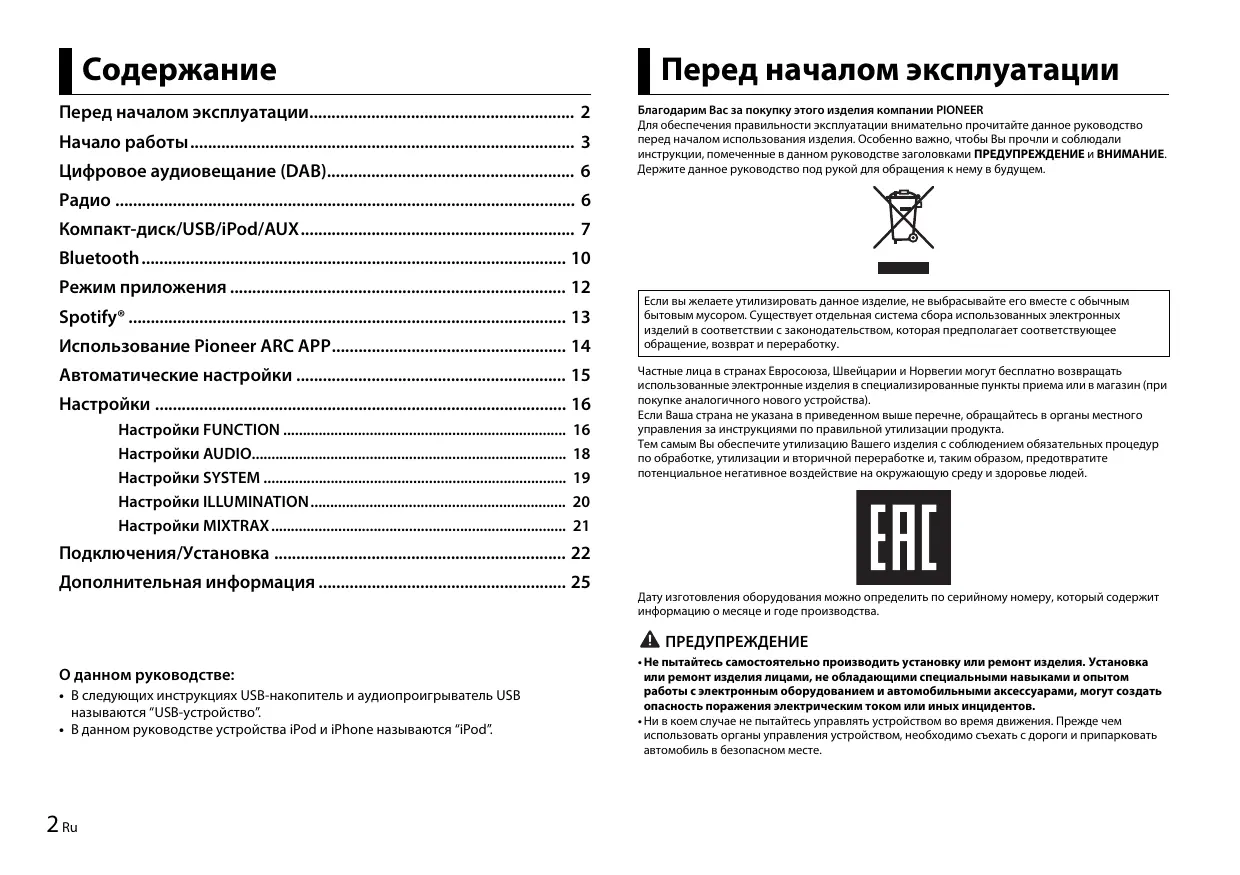 - Pioneer не гарантирует совместимость со всеми устройствами USB и не несет ответственности за любую потерю данных на медиапроигрывателях, смартфонах и других устройствах при использовании этого изделия.