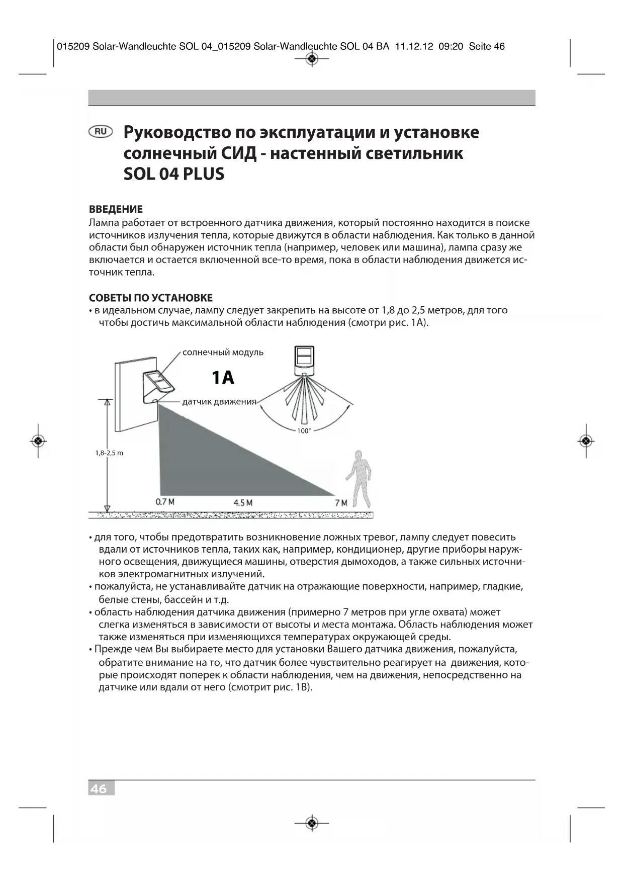 Akü: 3 x AA 1,2 V / 600 mAh LED sayısı: 2 x 0,5 W Yanış süresi: 60 ± 2 san. Güvenlik alanı: 100º Kapsam: mak. 7 Metre Duyarlılık: Gün ışığından geceye kadar ayarlanabilir Güvenlik türü: IP44 TASFİYE Elektrikli eşyaları çevre kurallarına göre tasfiye edin! Elektrikli cihazlar ev çöpüne atıl- maz. Elektrik – elektronik eski cihazlarla ilgili Avrupa normları 2002/96/EG gereğince, kullanılmış elektrikli cihazlar ayrıştırılarak saklanmalı ve çevreye uygun geri dönüşümü sağlanmalıdır. Cihazın tasfiyesi ile ilgili imkanlar için belediye yönetimlerine başvurabilirsiniz Pil ve akülerin hatalı tasfiyeden dolayı oluşan çevre kirliliği! Pil ve aküler ev çöpüne altılamaz. Ağır metal içerebilirler ve özel çöp olarak işlem görür. Bu nedenle kullanılmış pilleri yerel toplama yerlerine teslim ediniz. 015209 Solar-Wandleuchte SOL 04_015209 Solar-Wandleuchte SOL 04 BA 11.12.12 09:20 Seite 4546 Руководство по эксплуатации и установке солнечный СИД - настенный светильник SOL 04 PLUS ВВЕДЕНИЕЛампа работает от встроенного датчика движения, который постоянно находится в поискеисточников излучения тепла, которые движутся в области наблюдения. Как только в даннойобласти был обнаружен источник тепла (например, человек или машина), лампа сразу жевключается и остается включенной все-то время, пока в области наблюдения движется ис-точник тепла. СОВЕТЫ ПО УСТАНОВКЕ• в идеальном случае, лампу следует закрепить на высоте от 1,8 до 2,5 метров, для того чтобы достичь максимальной области наблюдения (смотри рис. 1А). • для того, чтобы предотвратить возникновение ложных тревог, лампу следует повесить вдали от источников тепла, таких как, например, кондиционер, другие приборы наруж-ного освещения, движущиеся машины, отверстия дымоходов, а также сильных источни-ков электромагнитных излучений. • пожалуйста, не устанавливайте датчик на отражающие поверхности, например, гладкие, белые стены, бассейн и т.д.• область наблюдения датчика движения (примерно 7 метров при угле охвата) может слегка изменяться в зависимости от высоты и места монтажа. Область наблюдения можеттакже изменяться при изменяющихся температурах окружающей среды. • Прежде чем Вы выбираете место для установки Вашего датчика движения, пожалуйста, обратите внимание на то, что датчик более чувствительно реагирует на движения, кото-рые происходят поперек к области наблюдения, чем на движения, непосредственно на датчике или вдали от него (смотрит рис. 1B).