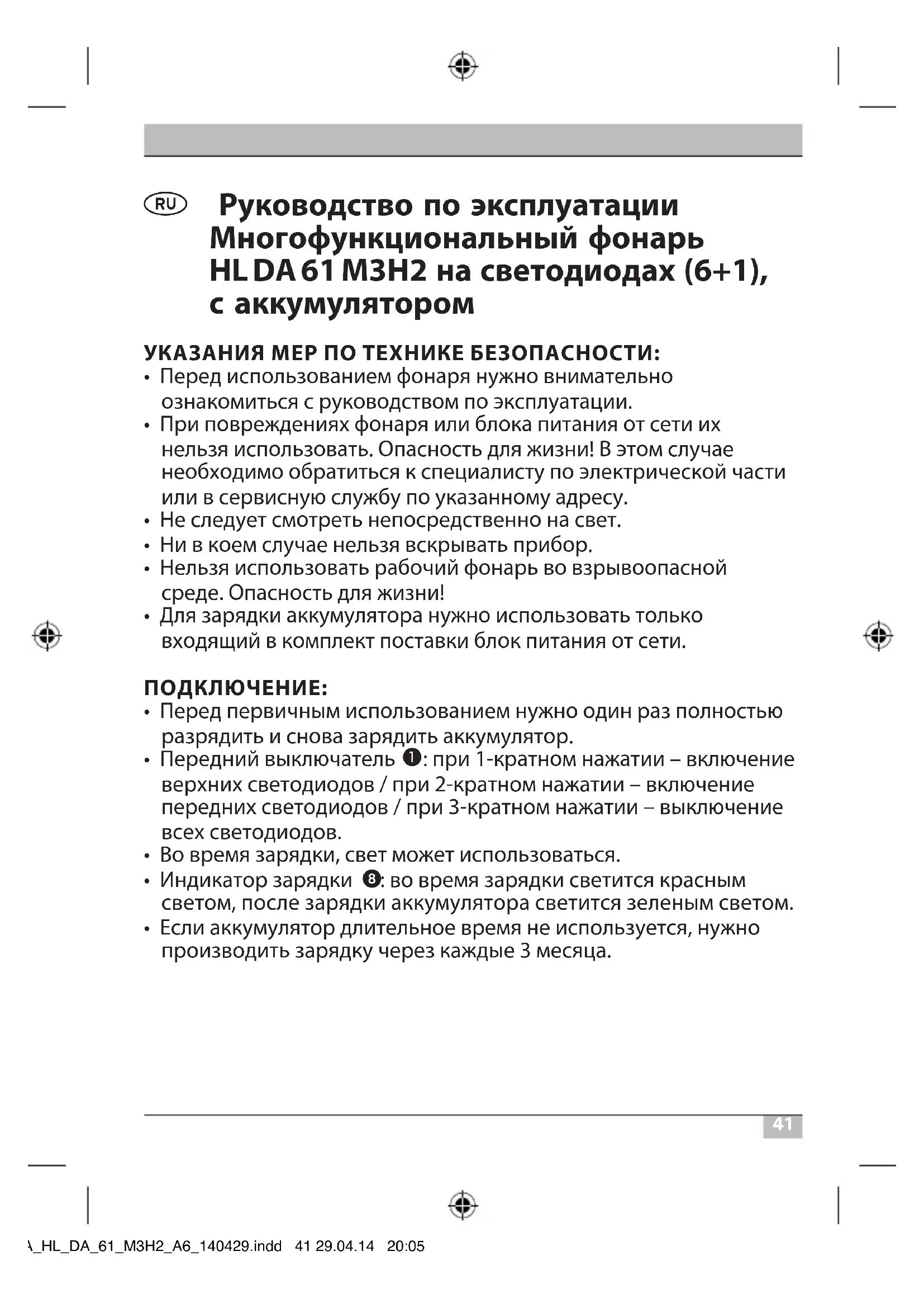 - Если аккумулятор длительное время не используется, нужно производить зарядку через каждые 3 месяца. BA_HL_DA_61_M3H2_A6_140429.indd 41 29.04.14 20:0542