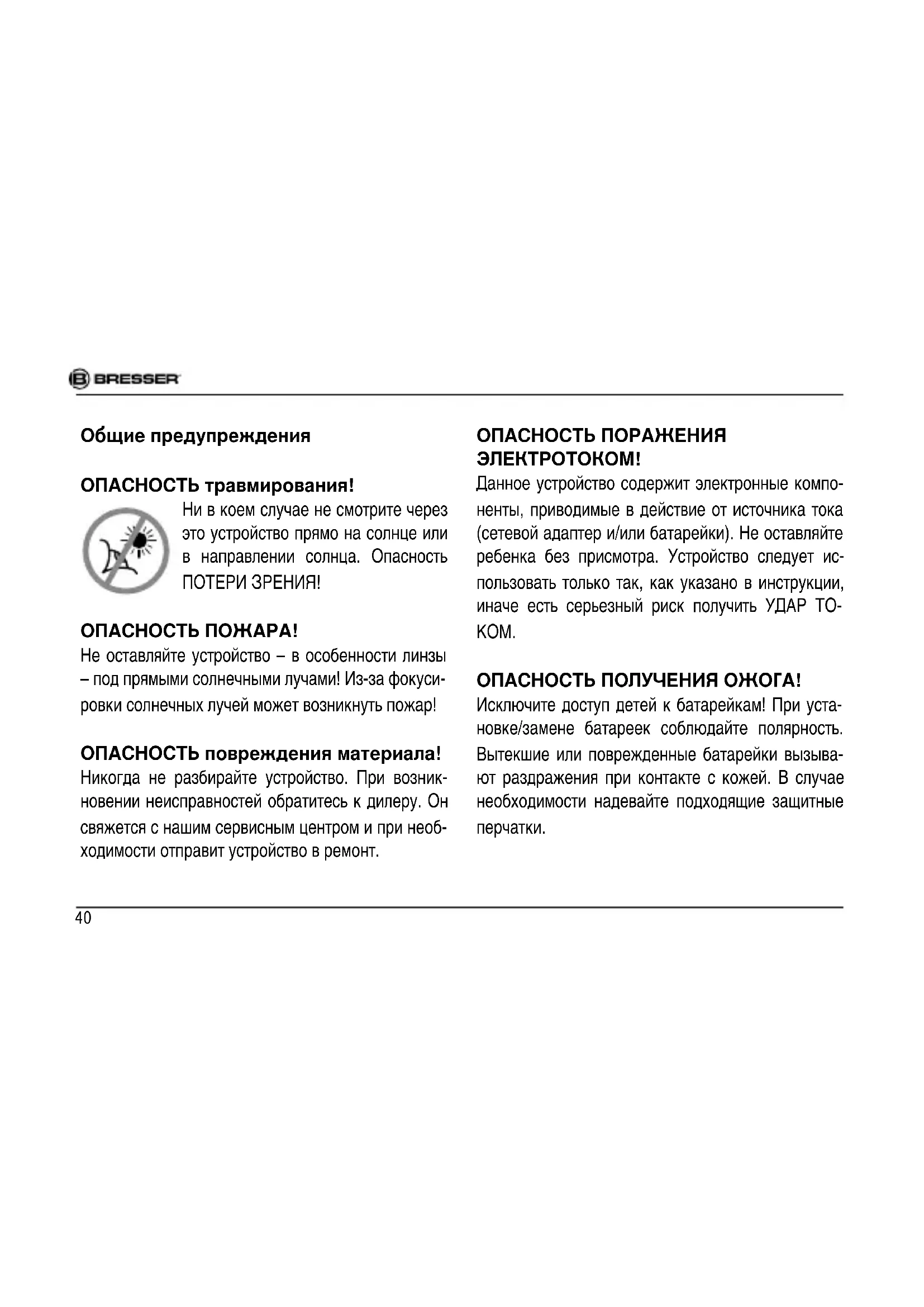El período regular de garantía es dos anos inicián- dose en el día de la compra. Para benefi ciarse de un período de garantía más largo y voluntario tal y como se indica en la caja de regalo es necesa- rio registrarse en nuestra página web. Las condiciones de garantía completas así como informaciones relativas a la ampliación de la garantía y los servicios pueden encontrarse en www.bresser.de/warranty_terms.40 Общие предупреждения ОПАСНОСТЬ травмирования! Ни в коем случае не смотрите через это устройство прямо на солнце или в направлении солнца. Опасность ПОТЕРИ ЗРЕНИЯ! ОПАСНОСТЬ ПОЖАРА! Не оставляйте устройство – в особенности линзы – под прямыми солнечными лучами! Из-за фокуси- ровки солнечных лучей может возникнуть пожар! ОПАСНОСТЬ повреждения материала! Никогда не разбирайте устройство. При возник- новении неисправностей обратитесь к дилеру. Он свяжется с нашим сервисным центром и при необ- ходимости отправит устройство в ремонт. ОПАСНОСТЬ ПОРАЖЕНИЯ ЭЛЕКТРОТОКОМ! Данное устройство содержит электронные компо- ненты, приводимые в действие от источника тока (сетевой адаптер и/или батарейки). Не оставляйте ребенка без присмотра. Устройство следует ис- пользовать только так, как указано в инструкции, иначе есть серьезный риск получить УДАР ТО-