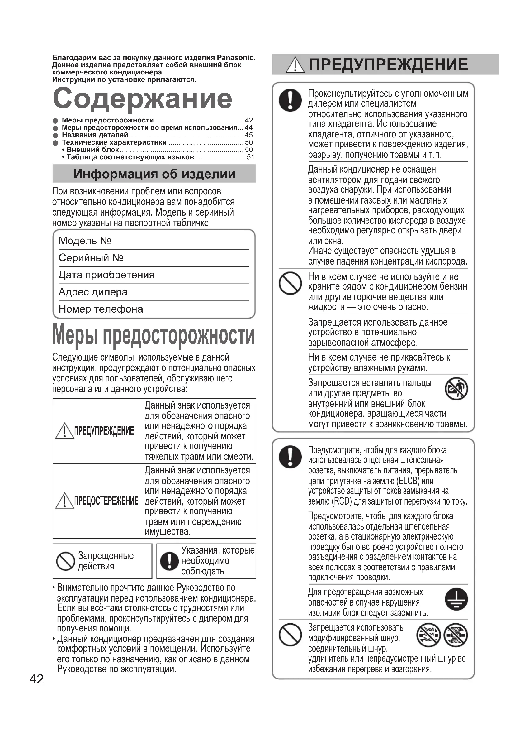 - Таблицасоответствующихязыков ........................ 51 БлагодаримвасзапокупкуданногоизделияPanasonic.Данноеизделиепредставляетсобойвнешнийблоккоммерческогокондиционера.Инструкциипоустановкеприлагаются. Мерыпредосторожности Информацияобизделии При возникновении проблем или вопросов относительно кондиционера вам понадобится следующая информация. Модель и серийный номер указаны на паспортной табличке.