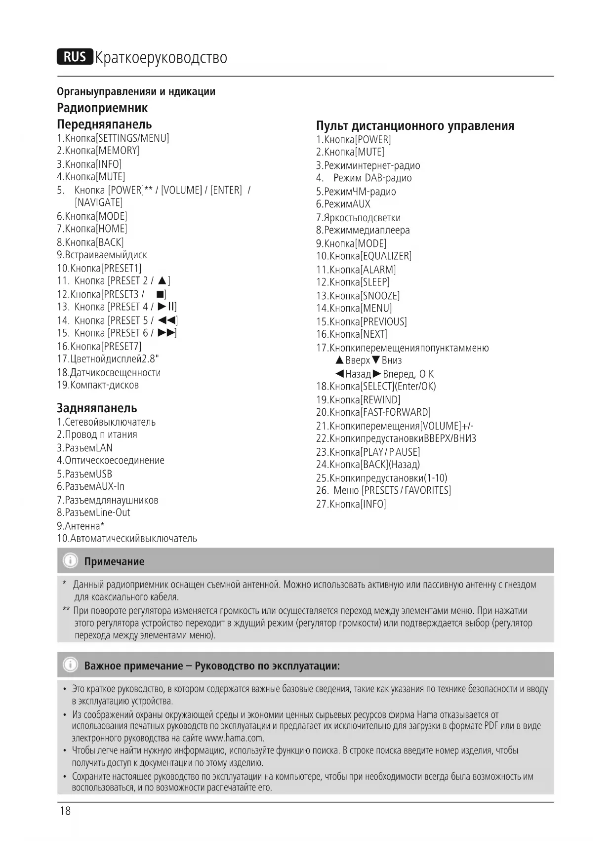 - Данный радиоприемник оснащен съемной антенной. Можно использова ть активную или пассивную антенну сгнездом для коаксиальногокабеля. ** При повороте регулятора изменяется громк ость или осуществляется переход между элементами меню. При нажатии этого регулятора устройство переходит вждущий режим (регулятор громкости) или подтверждается выбор (регулятор переходамежду элементами меню). Важное примечание – Руководство по эксплуатации: