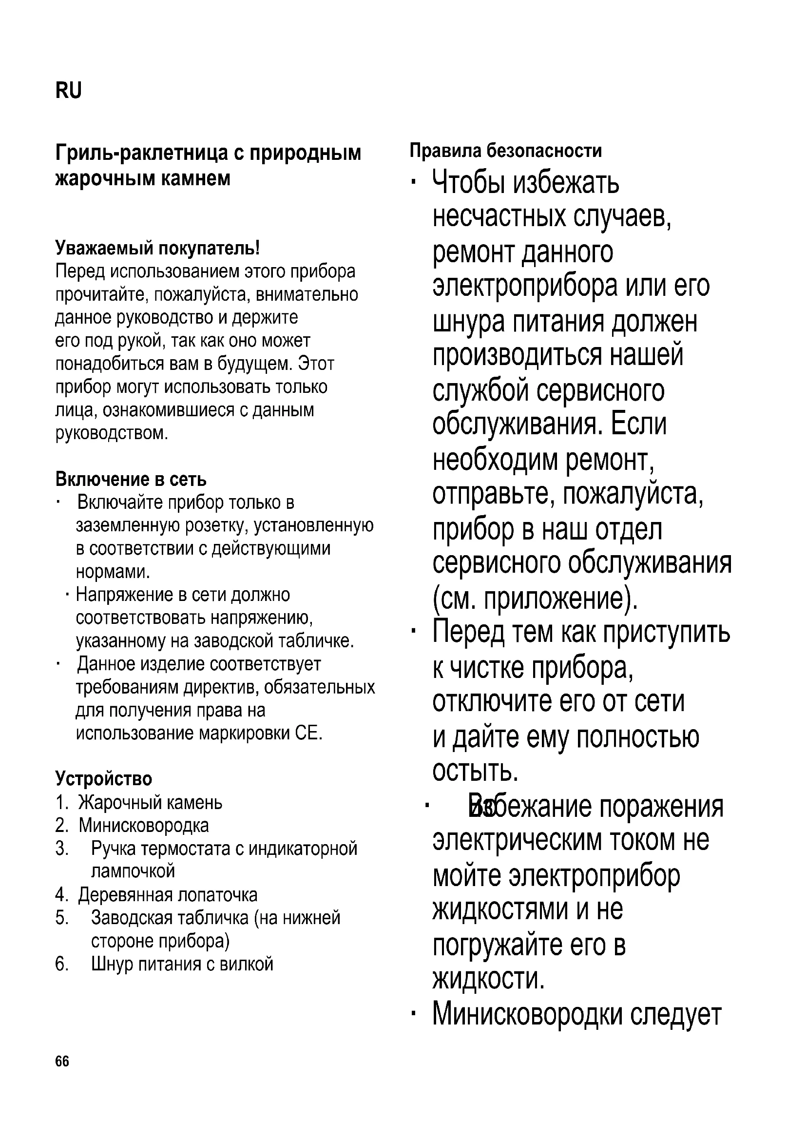Гриль-раклетница с природным жарочным камнем Уважаемый покупатель! Перед использованием этого прибора прочитайте, пожалуйста, внимательно данное руководство и держите его под рукой, так как оно может понадобиться вам в будущем. Этот прибор могут использовать только лица, ознакомившиеся с данным руководством. Включение в сеть ∙ Включайте прибор только в заземленную розетку, установленную в соответствии с действующими