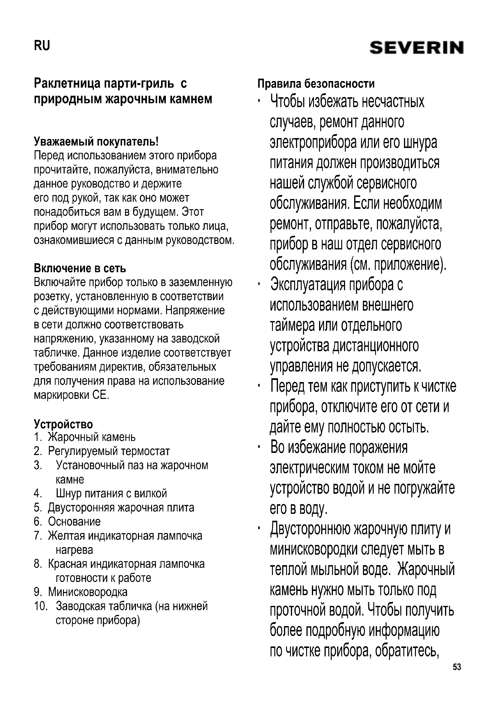 Раклетница парти-гриль с природным жарочным камнем Уважаемый покупатель! Перед использованием этого прибора прочитайте, пожалуйста, внимательно данное руководство и держите его под рукой, так как оно может понадобиться вам в будущем. Этот прибор могут использовать только лица, ознакомившиеся с данным руководством. Включение в сеть Включайте прибор только в заземленную розетку, установленную в соответствии с действующими нормами. Напряжение