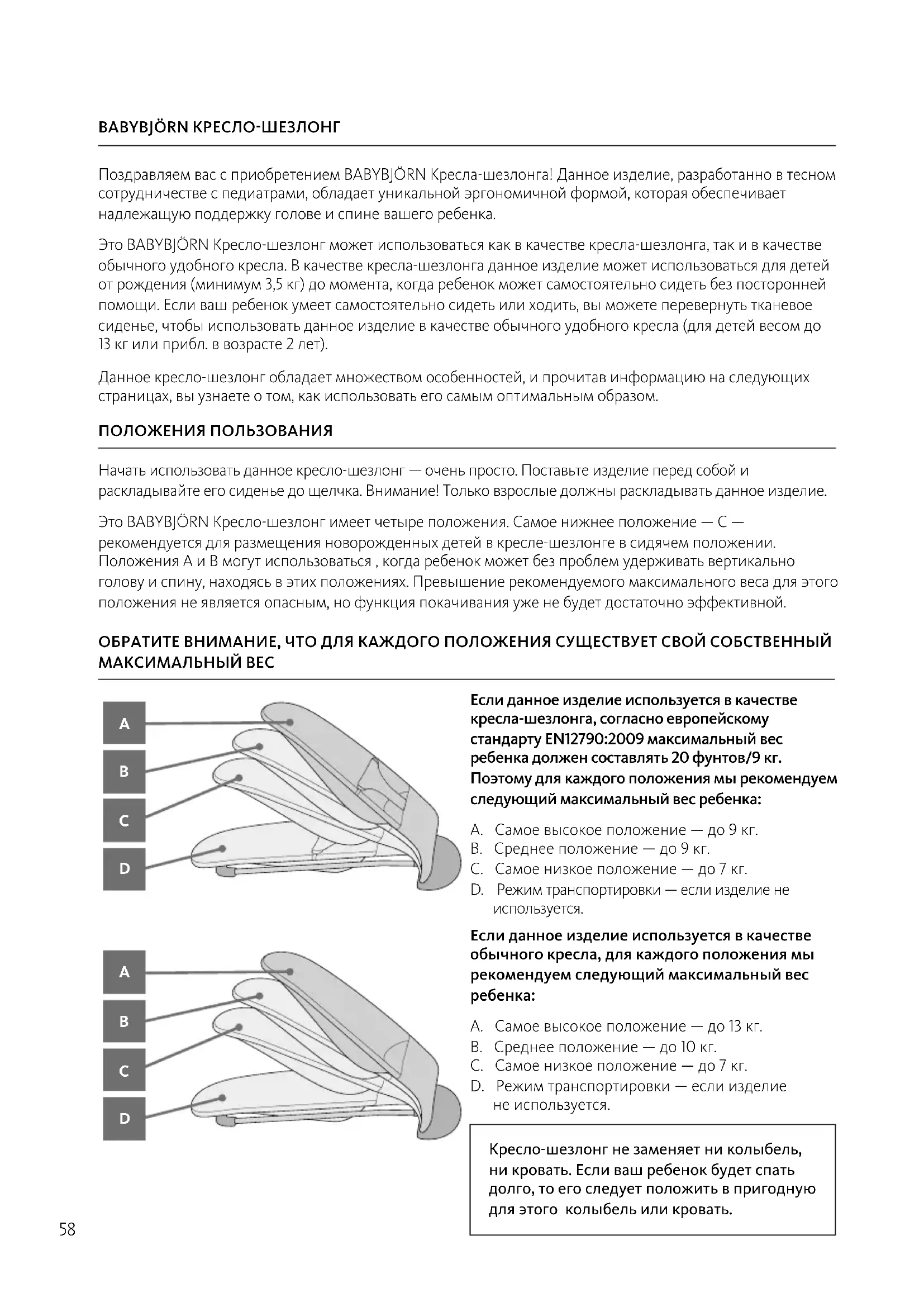 - Neleiskite vaikui sulankstyti ar iskleisti kėdutės.58 BABYBJÖRN КРЕСЛОШЕЗЛОНГ Поздравляем вас с приобретением BABYBJÖRN Kресла-шезлонга! Данное изделие, разработанно в тесном сотрудничестве с педиатрами, обладает уникальной эргономичной формой, которая обеспечивает надлежащую поддержку голове и спине вашего ребенка. Это BABYBJÖRN Кресло-шезлонг может использоваться как в качестве кресла-шезлонга, так и в качестве обычного удобного кресла. В качестве кресла-шезлонга данное изделие может использоваться для детей от рождения (минимум 3,5 кг) до момента, когда ребенок может самостоятельно сидеть без посторонней помощи. Если ваш ребенок умеет самостоятельно сидеть или ходить, вы можете перевернуть тканевое сиденье, чтобы использовать данное изделие в качестве обычного удобного кресла (для детей весом до 13кг или прибл. в возрасте 2 лет). Данное кресло-шезлонг обладает множеством особенностей, и прочитав информацию на следующих страницах, вы узнаете о том, как использовать его самым оптимальным образом. Если данное изделие используется в качестве кресла-шезлонга, согласно европейскому стандарту EN: максимальный вес ребенка должен составлять фунтов/ кг. Поэтому для каждого положения мы рекомендуем следующий максимальный вес ребенка: A. Самое высокое положение — до 9 кг. B. Среднее положение — до 9 кг. C. Самое низкое положение — до 7 кг. D. Режим транспортировки — если изделие не используется. ОБРАТИТЕ ВНИМАНИЕ, ЧТО ДЛЯ КАЖДОГО ПОЛОЖЕНИЯ СУЩЕСТВУЕТ СВОЙ СОБСТВЕННЫЙ МАКСИМАЛЬНЫЙ ВЕС Если данное изделие используется в качестве обычного кресла, для каждого положения мы рекомендуем следующий максимальный вес
