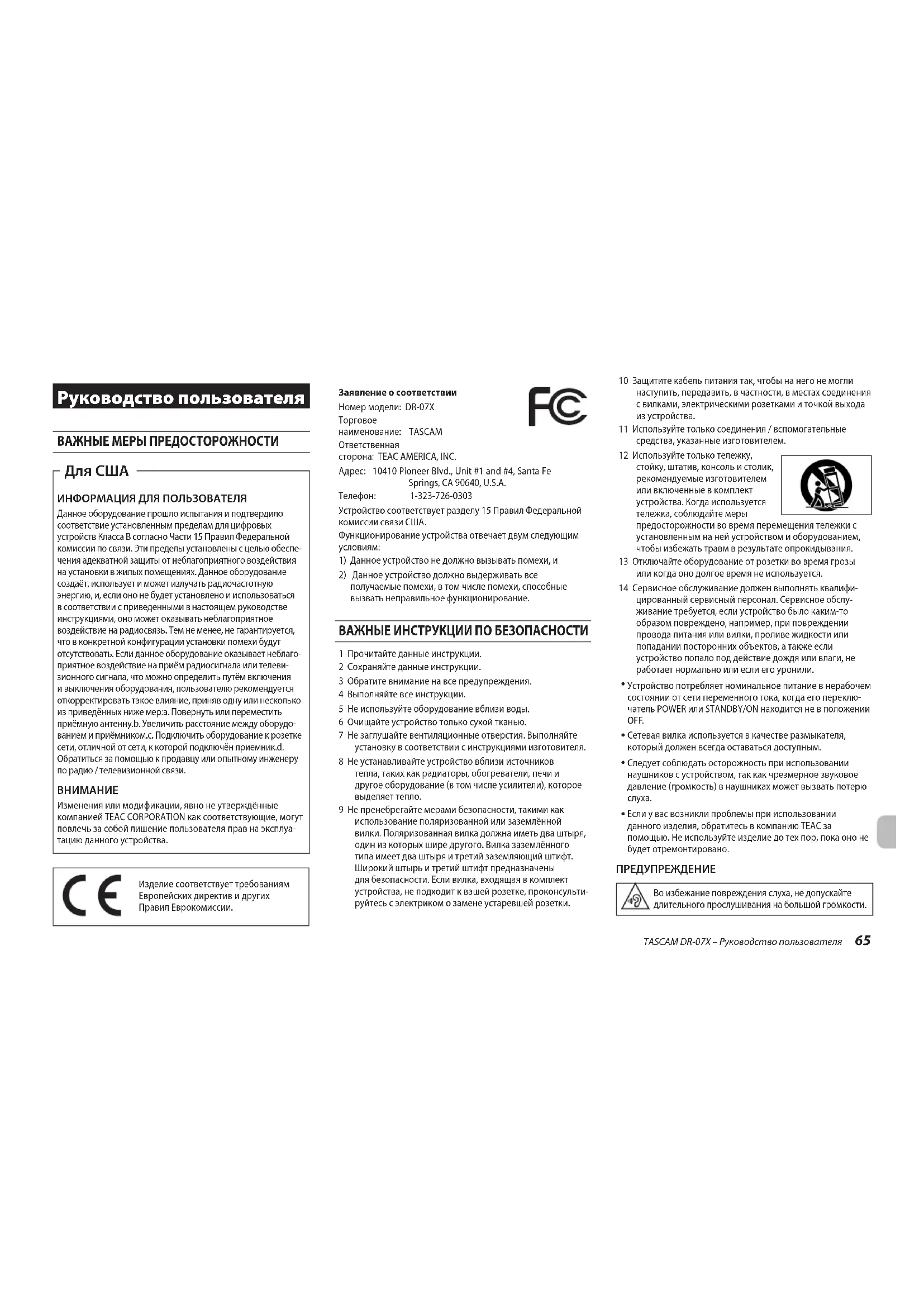 Сетевая вилка используется в качестве размыкателя, который должен всегда оставаться доступным. Следует соблюдать осторожность при использовании наушников с устройством, так как чрезмерное звуковое давление (громкость) в наушниках может вызвать потерю слуха. Если у вас возникли проблемы при использовании данного изделия, обратитесь в компанию TEAC за помощью. Не используйте изделие до тех пор, пока оно не будет отремонтировано. ПРЕДУПРЕЖДЕНИЕ Во избежание повреждения слуха, не допускайте длительного прослушивания на большой громкости.TASCAM DR-07X – Руководство пользователя 65ВНИМАНИЕ