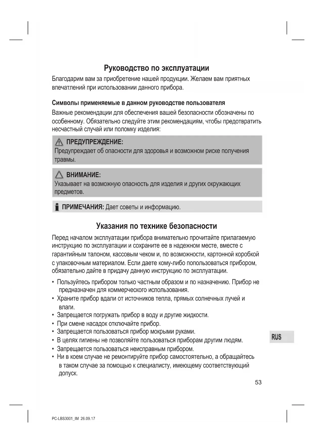 - Ни в коем случае не ремонтируйте прибор самостоятельно, а обращайтесь в таком случае за помощью к специалисту, имеющему соответствующий допуск.PC-LBS3001_IM 26.09.17