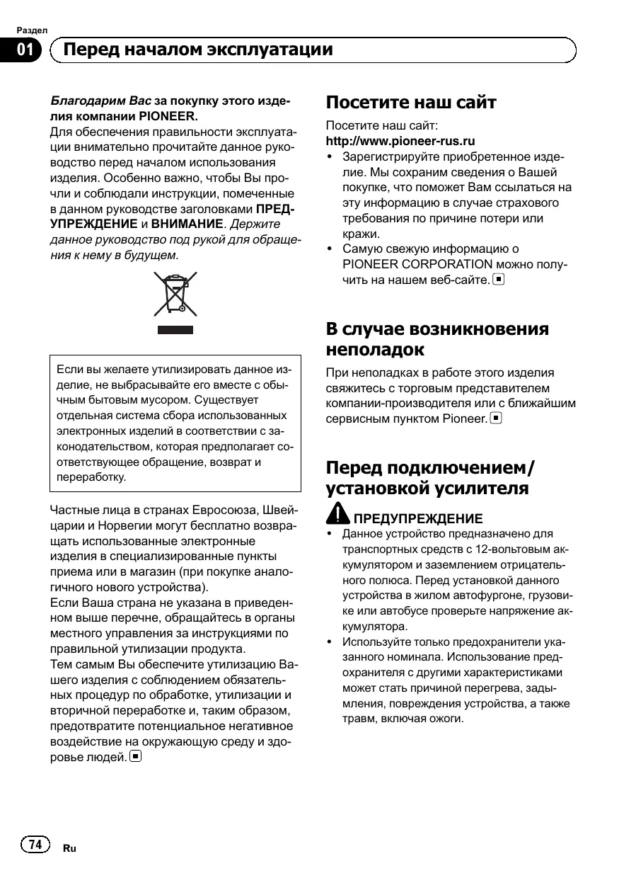 Перед началом эксплуатации Благодарим Вас за покупку этого изделия компании PIONEER. Для обеспечения правильности эксплуатации внимательно прочитайте данное руководство перед началом использования изделия. Особенно важно, чтобы Вы прочли и соблюдали инструкции, помеченные в данном руководстве заголовками ПРЕДУПРЕЖДЕНИЕ и ВНИМАНИЕ. Держите данное руководство под рукой для обращения к нему в будущем. Посетите наш сайт Посетите наш сайт: http://www.pioneer-rus.ru ! Зарегистрируйте приобретенное изделие. Мы сохраним сведения о Вашей покупке, что поможет Вам ссылаться на эту информацию в случае страхового требования по причине потери или ! Самую свежую информацию о PIONEER CORPORATION можно получить на нашем веб-сайте. В случае возникновения Если вы желаете утилизировать данное изделие, не выбрасывайте его вместе с обычным бытовым мусором. Существует отдельная система сбора использованных электронных изделий в соответствии с законодательством, которая предполагает соответствующее обращение, возврат и переработку. Частные лица в странах Евросоюза, Швейцарии и Норвегии могут бесплатно возвращать использованные электронные изделия в специализированные пункты приема или в магазин (при покупке аналогичного нового устройства). Если Ваша страна не указана в приведенном выше перечне, обращайтесь в органы местного управления за инструкциями по правильной утилизации продукта. Тем самым Вы обеспечите утилизацию Вашего изделия с соблюдением обязательных процедур по обработке, утилизации и вторичной переработке и, таким образом, предотвратите потенциальное негативное воздействие на окружающую среду и здоровье людей.
