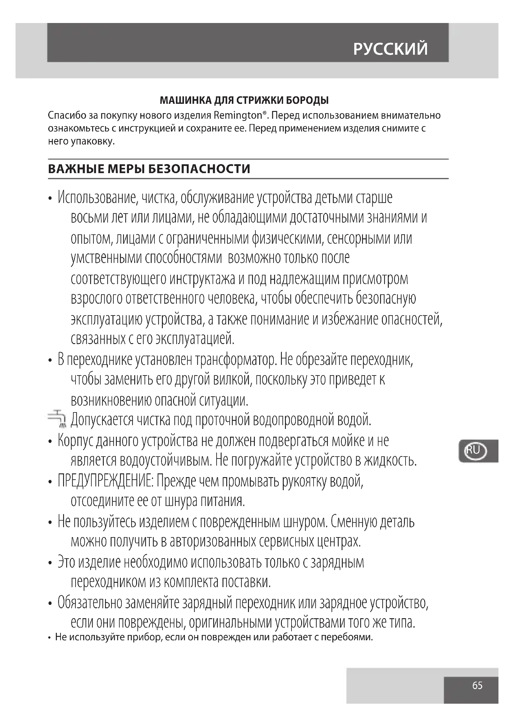 - В переходнике установлен трансформатор. Не обрезайте переходник, чтобы заменить его другой вилкой, поскольку это приведет к возникновению опасной ситуации. Допускается чистка под проточной водопроводной водой.
