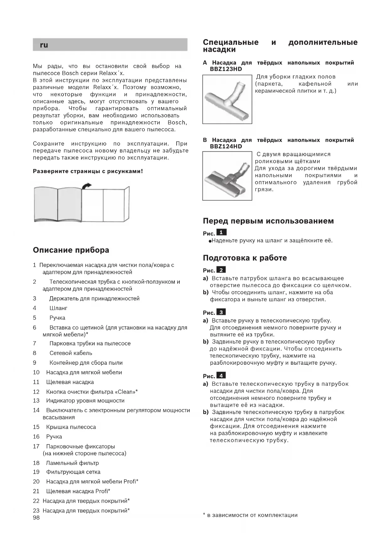 Figyelem: A tisztításhoz ne használjon súrolószert, üveg- vagy általános tisztítószert. A porszívót soha ne tegye vízbe! Műszaki változtatások joga fenntartva.98 Мы рады, что вы остановили свой выбор на пылесосе Bosch серии Relaxx´x. В этой инструкции по эксплуатации представлены различные модели Relaxx´x. Поэтому возможно, что некоторые функции и принадлежности, описанные здесь, могут отсутствовать у вашего прибора. Чтобы гарантировать оптимальный результат уборки, вам необходимо использовать только оригинальные принадлежности Bosch, разработанные специально для вашего пылесоса. Сохраните инструкцию по эксплуатации. При передаче пылесоса новому владельцу не забудьте передать также инструкцию по эксплуатации. Разверните страницы с рисунками! Описание прибора 1 Переключаемая насадка для чистки пола/ковра с адаптером для принадлежностей 2 Телескопическая трубка с кнопкой-ползунком и адаптером для принадлежностей 3 Держатель для принадлежностей 4 Шланг 5 Ручка 6 Вставка со щетиной (для установки на насадку для мягкой мебели)* 7 Парковка трубки на пылесосе 8 Сетевой кабель 9 Контейнер для сбора пыли 10 Насадка для мягкой мебели 11 Щелевая насадка 12 Кнопка очистки фильтра «Clean»* 13 Индикатор уровня мощности 14 Выключатель с электронным регулятором мощности
