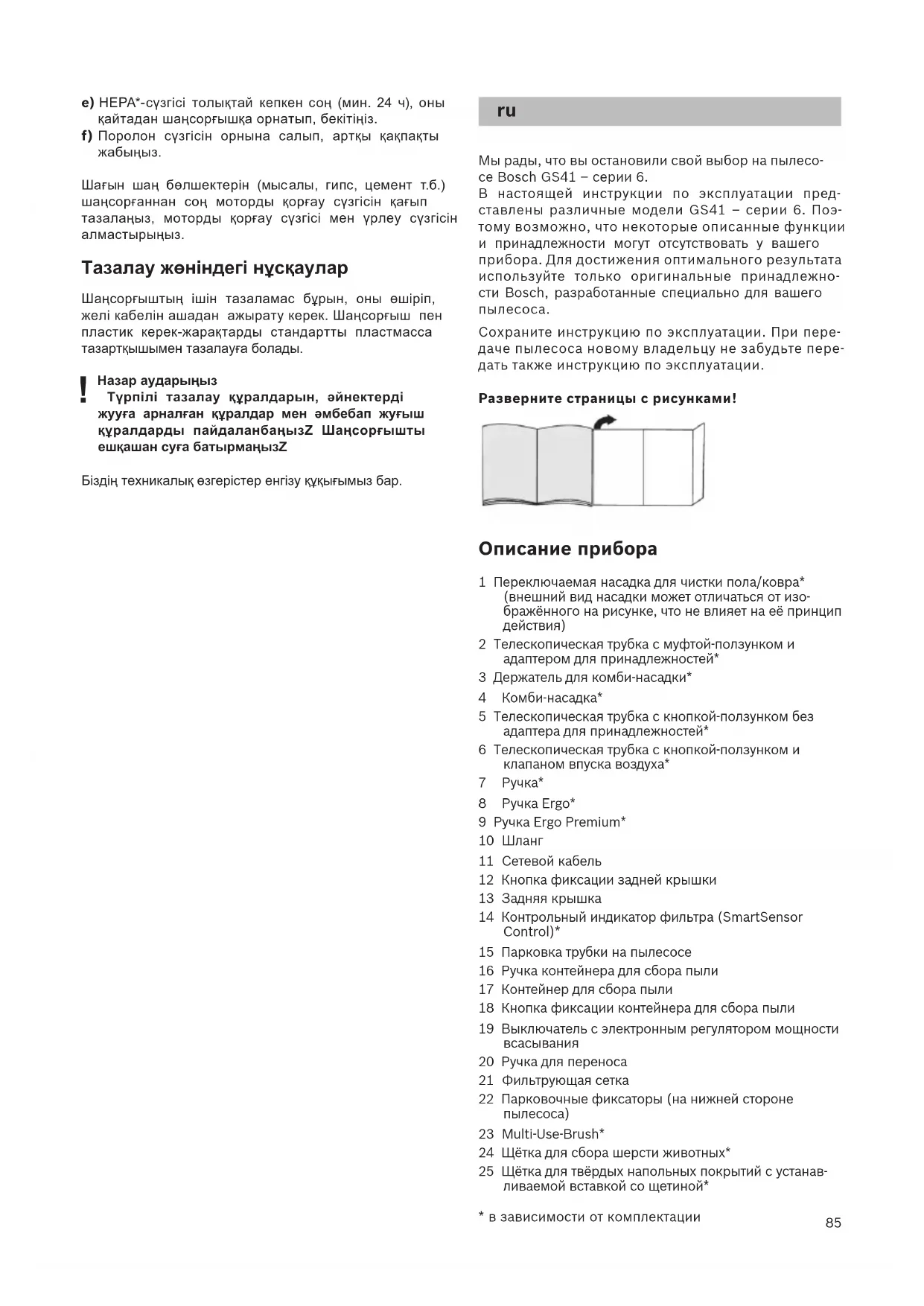 - в зависимости от комплектации Мы рады, что вы остановили свой выбор на пылесо- се Bosch GS41 – серии 6. В настоящей инструкции по эксплуатации пред- ставлены различные модели GS41 – серии 6. Поэ- тому возможно, что некоторые описанные функции и принадлежности могут отсутствовать у вашего прибора. Для достижения оптимального результата используйте только оригинальные принадлежно- сти Bosch, разработанные специально для вашего