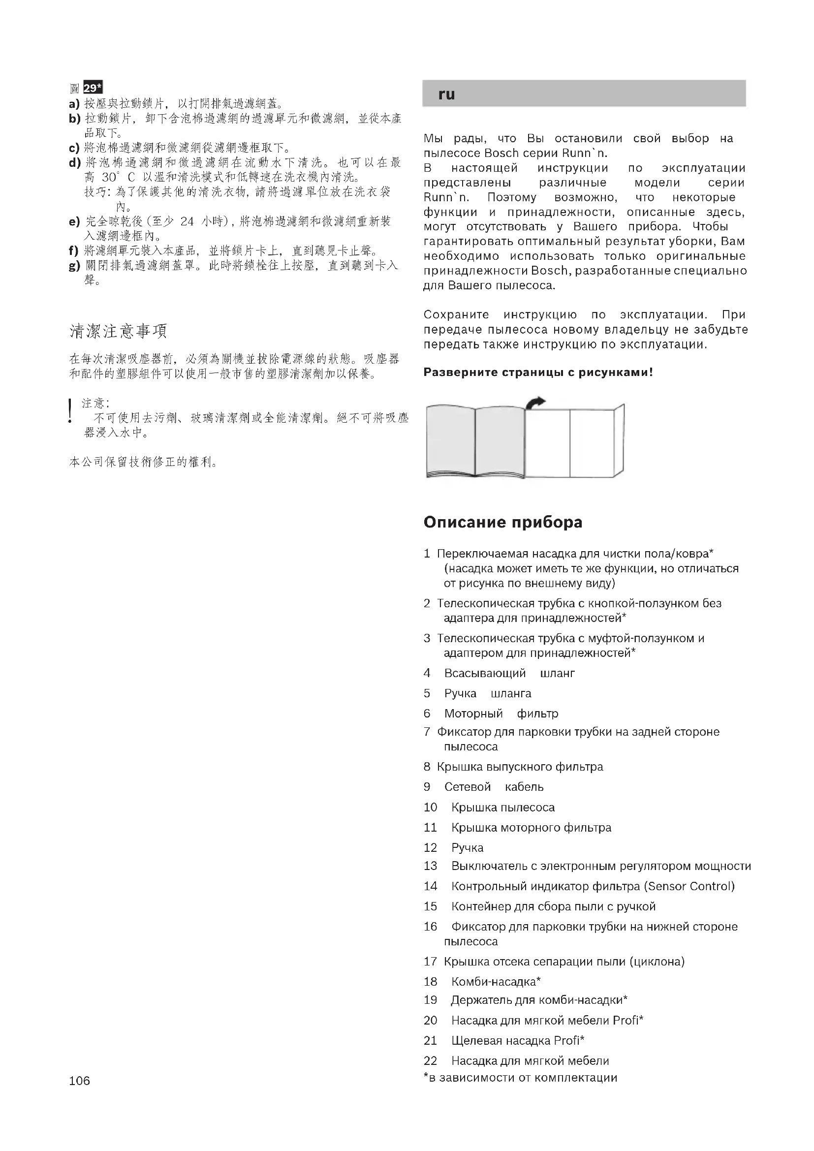 - 視配備規格而定106 Мы рады, что Вы остановили свой выбор на пылесосе Bosch серии Runn`n. В настоящей инструкции по эксплуатации представлены различные модели серии Runn`n. Поэтому возможно, что некоторые функции и принадлежности, описанные здесь, могут отсутствовать у Вашего прибора. Чтобы гарантировать оптимальный результат уборки, Вам необходимо использовать только оригинальные принадлежности Bosch, разработанные специально для Вашего пылесоса. Сохраните инструкцию по эксплуатации. При передаче пылесоса новому владельцу не забудьте передать также инструкцию по эксплуатации. Разверните страницы с рисунками! Описание прибора 1 Переключаемая насадка для чистки пола/ковра* (насадка может иметь те же функции, но отличаться от рисунка по внешнему виду) 2 Телескопическая трубка с кнопкой-ползунком без адаптера для принадлежностей* 3 Телескопическая трубка с муфтой-ползунком и адаптером для принадлежностей* 4 Всасывающий шланг 5 Ручка шланга 6 Моторный фильтр 7 Фиксатор для парковки трубки на задней стороне