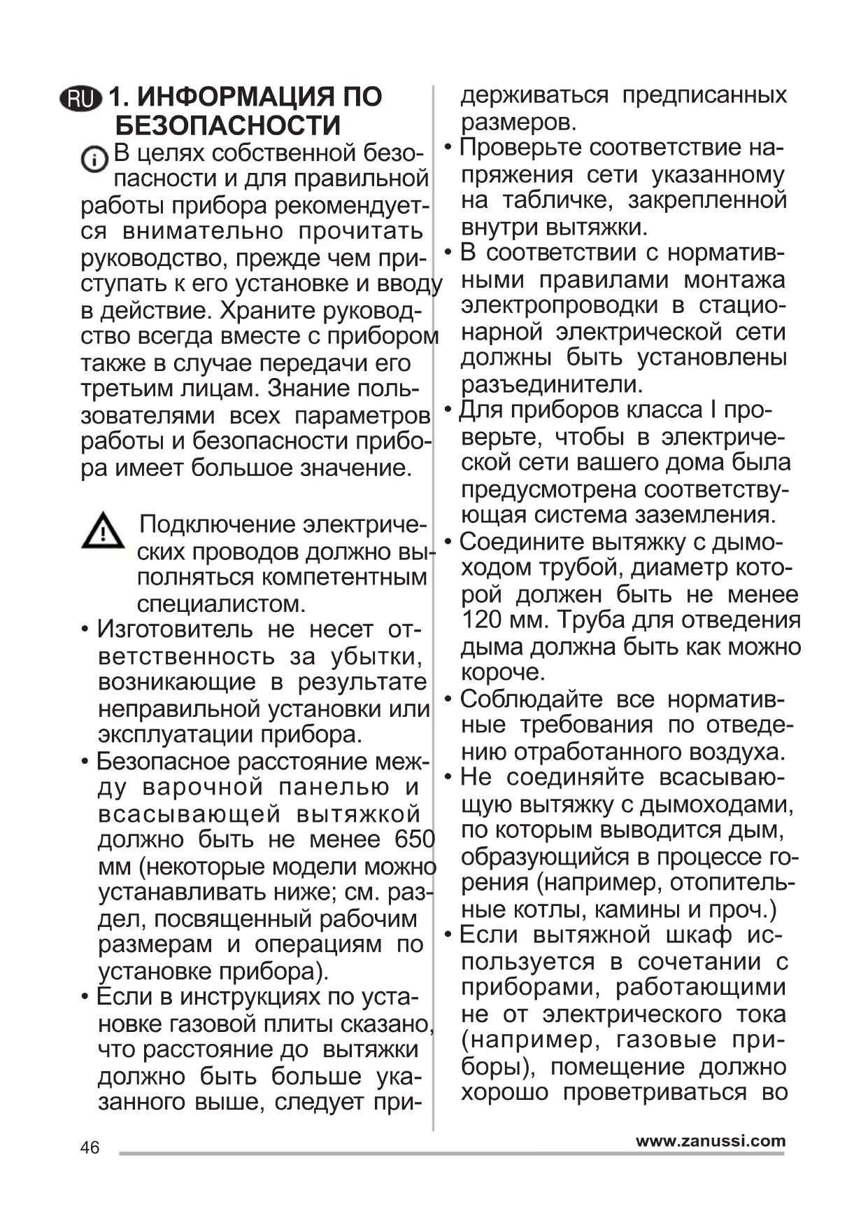 - Если вытяжной шкаф ис- пользуется в сочетании с приборами, работающими не от электрического тока (например, газовые при- боры), помещение должно хорошо проветриваться во RU47 www.zanussi.com избежание обратного потока отходящих газов. При поль- зовании кухонной вытяжкой в сочетании с приборами, работающими не от электри- ческого тока, отрицательное давление в помещении не должно превышать 0,04 мбар с тем, чтобы дым не всасы- вался вытяжкой обратно в