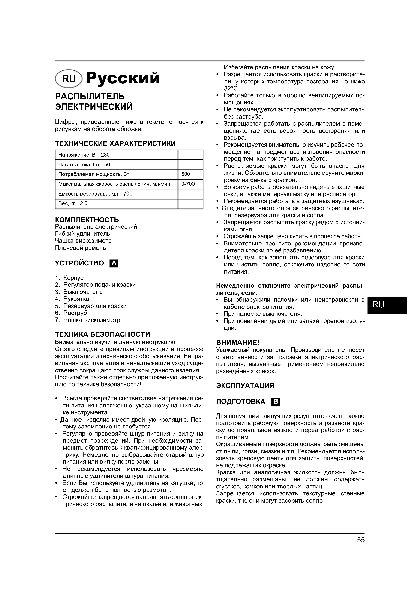 Уважаемый покупатель! Производитель не несет ответственности за поломки электрического рас- пылителя, вызванные применением неправильно разведённых красок. ЭКСПЛУАТАЦИЯ ПОДГОТОВКА B Для получения наилучших результатов очень важно подготовить рабочую поверхность и развести кра- ску до правильной вязкости перед работой с рас-