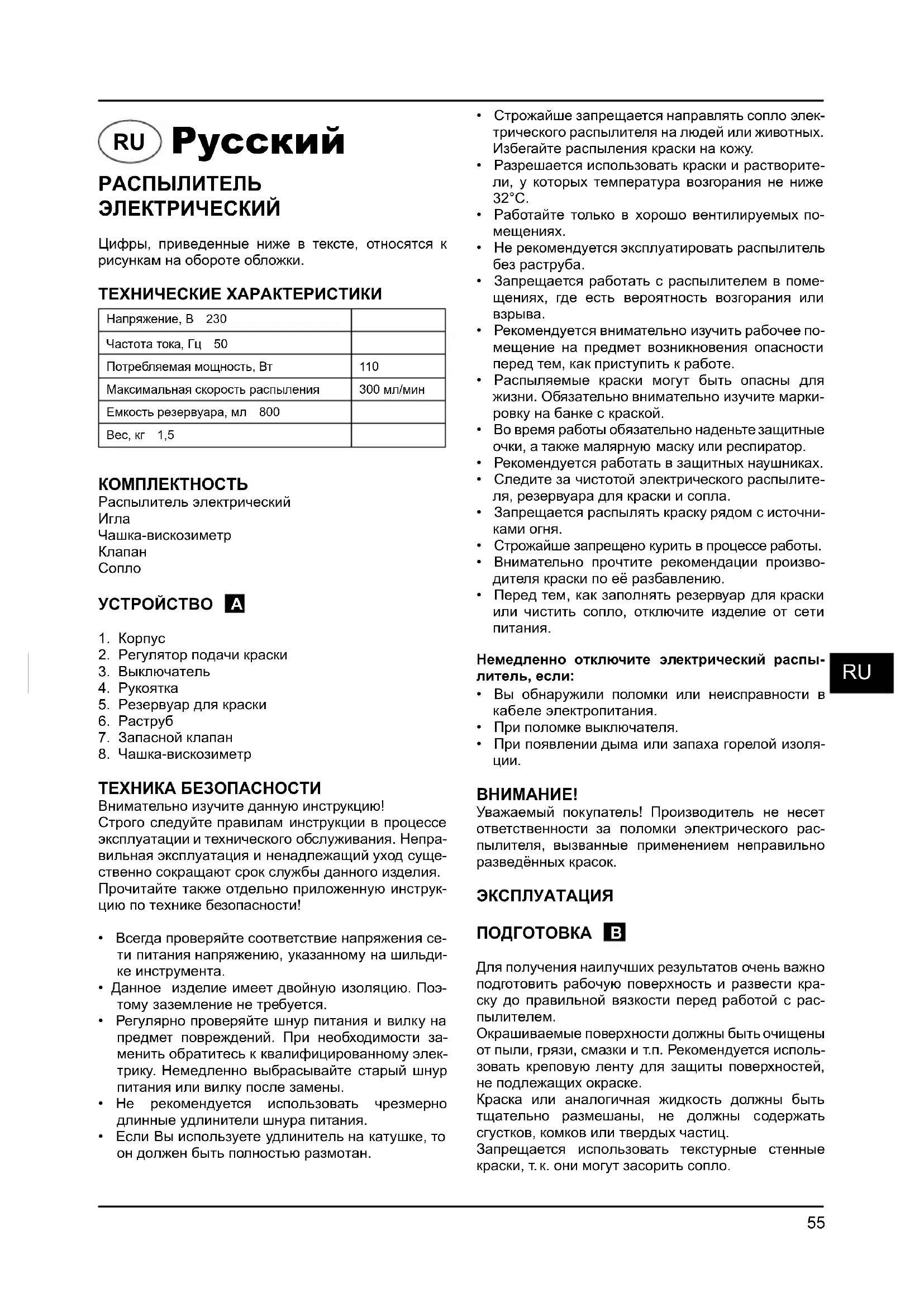 РАСПЫЛИТЕЛЬ ЭЛЕКТРИЧЕСКИЙ Цифры, приведенные ниже в тексте, относятся к рисункам на обороте обложки. ТЕХНИЧЕСКИЕ ХАРАКТЕРИСТИКИ Напряжение, В 230Частота тока, Гц 50 Потребляемая мощность, Вт 110 Максимальная скорость распыления 300 мл/мин Емкость резервуара, мл 800Вес, кг 1,5 КОМПЛЕКТНОСТЬ Распылитель электрический