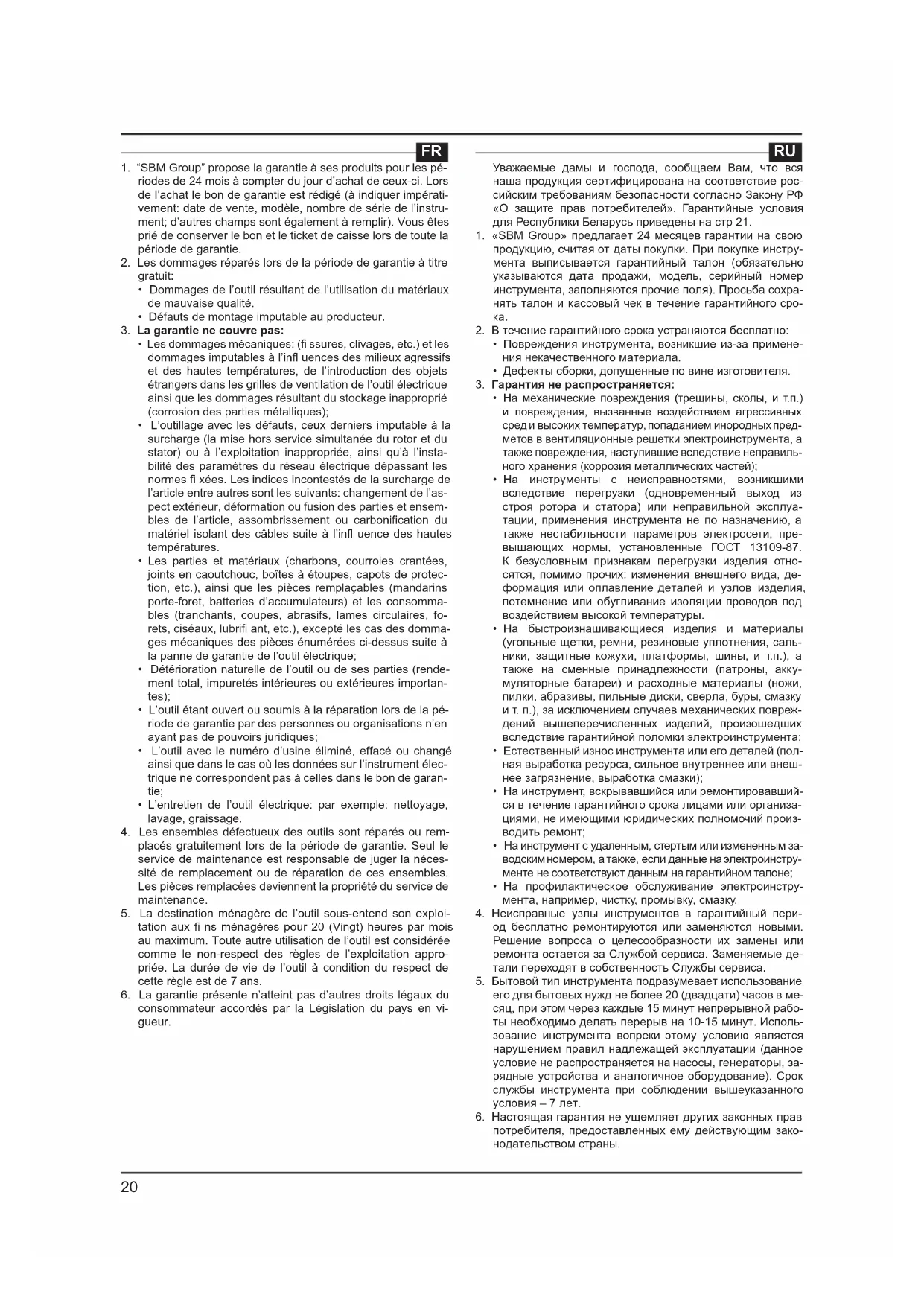 «SBM Group» предлагает 24 месяцев гарантии на свою продукцию, считая от даты покупки. При покупке инструмента выписывается гарантийный талон (обязательно указываются дата продажи, модель, серийный номер инструмента, заполняются прочие поля). Просьба сохранять талон и кассовый чек в течение гарантийного срока.