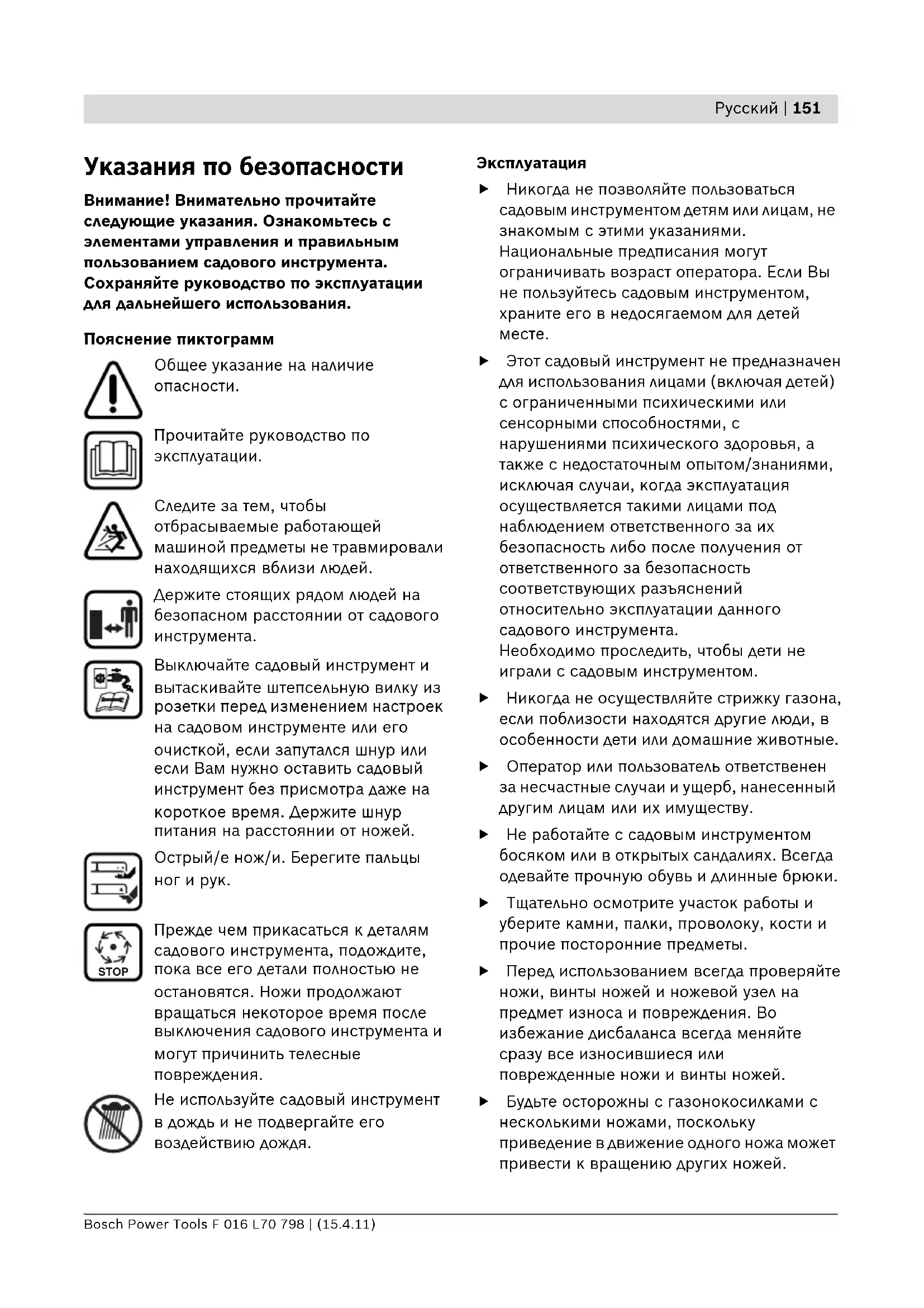 f Этот садовый инструмент не предназначен для использования лицами (включая детей) с ограниченными психическими или сенсорными способностями, с нарушениями психического здоровья, а также с недостаточным опытом/знаниями, исключая случаи, когда эксплуатация осуществляется такими лицами под наблюдением ответственного за их безопасность либо после получения от ответственного за безопасность соответствующих разъяснений относительно эксплуатации данного садового инструмента. Необходимо проследить, чтобы дети не играли с садовым инструментом. f Никогда не осуществляйте стрижку газона, если поблизости находятся другие люди, в особенности дети или домашние животные. f Оператор или пользователь ответственен за несчастные случаи и ущерб, нанесенный другим лицам или их имуществу. f Не работайте с садовым инструментом босяком или в открытых сандалиях. Всегда одевайте прочную обувь и длинные брюки. f Тщательно осмотрите участок работы и уберите камни, палки, проволоку, кости и прочие посторонние предметы. f Перед использованием всегда проверяйте ножи, винты ножей и ножевой узел на предмет износа и повреждения. Во избежание дисбаланса всегда меняйте сразу все износившиеся или поврежденные ножи и винты ножей. f Будьте осторожны с газонокосилками с несколькими ножами, поскольку приведение в движение одного ножа может привести к вращению других ножей. STOP OBJ_BUCH-1393-001.book Page 151 Friday, April 15, 2011 10:36 AM152 | Русский F 016 L70 798 | (15.4.11) Bosch Power Tools f Косите только при дневном свете либо хорошем искусственном освещении. f По возможности не пользуйтесь садовым инструментом на влажной траве. f Передвигайтесь всегда спокойно, никогда