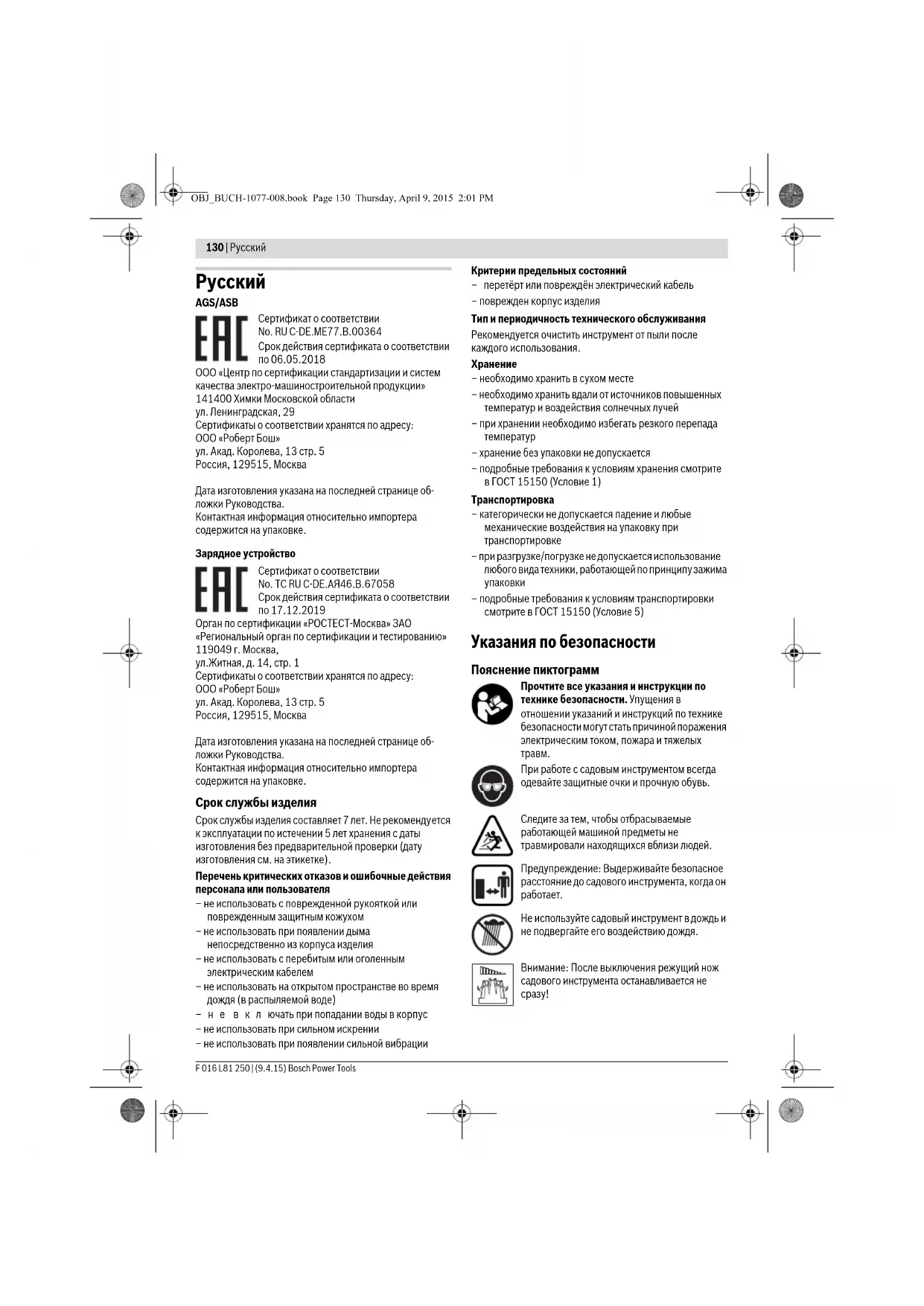 AGS/ASB Сертификат о соответствии No. RU C-DE.ME77.B.00364 Срок действия сертификата о соответствии по 06.05.2018 ООО «Центр по сертификации стандартизации и систем качества электро-машиностроительной продукции» 141400 Химки Московской области ул. Ленинградская, 29 Сертификаты о соответствии хранятся по адресу: ООО «Роберт Бош» ул. Акад. Королева, 13 стр. 5 Россия, 129515, Москва Дата изготовления указана на последней странице об- ложки Руководства. Контактная информация относительно импортера содержится на упаковке. Зарядное устройство Сертификат о соответствии No. ТС RU С-DE.АЯ46.В.67058 Срок действия сертификата о соответствии по 17.12.2019 Орган по сертификации «РОСТЕСТ-Москва» ЗАО «Региональный орган по сертификации и тестированию» 119049 г. Москва, ул.Житная, д. 14, стр. 1 Сертификаты о соответствии хранятся по адресу: ООО «Роберт Бош» ул. Акад. Королева, 13 стр. 5 Россия, 129515, Москва Дата изготовления указана на последней странице об- ложки Руководства. Контактная информация относительно импортера содержится на упаковке. Срок службы изделия Срок службы изделия составляет 7 лет. Не рекомендуется к эксплуатации по истечении 5 лет хранения с даты изготовления без предварительной проверки (дату изготовления см. на этикетке). Перечень критических отказов и ошибочные действия персонала или пользователя – не использовать с поврежденной рукояткой или поврежденным защитным кожухом – не использовать при появлении дыма непосредственно из корпуса изделия – не использовать с перебитым или оголенным электрическим кабелем – не использовать на открытом пространстве во время дождя (в распыляемой воде) –не включать при попадании воды в корпус – не использовать при сильном искрении – не использовать при появлении сильной вибрации Критерии предельных состояний – перетёрт или повреждён электрический кабель – поврежден корпус изделия Тип и периодичность технического обслуживания Рекомендуется очистить инструмент от пыли после каждого использования.