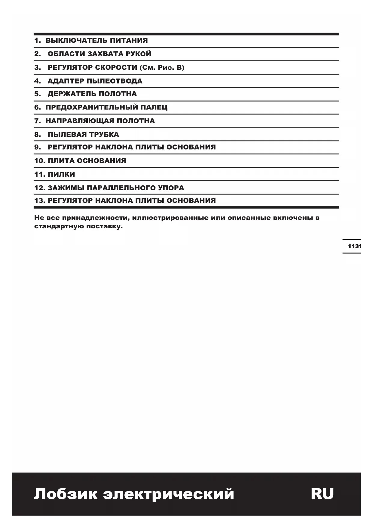 Распределите задачи так, чтобы работы, сопровождающиеся высоким уровнем вибрации, проводились через большие промежутки времени. ПРИНАДЛЕЖНОСТИ Шестигранный ключ 1 Пылевая трубка 1 Параллельный упор 1 Пильное полотно по дереву: 100mm x 10TPI, HCS 1 Пильное полотно по металлу: 92mm x 21TPI, BIM 1 Пильное полотно по алюминию: 100mm x 8TPI, HSS 1 Рекомендуется приобретать все принадлежности в том же магазине, где был приобретен инструмент. Используйте качественные принадлежности с указанием общеизвестной торговой марки. За более подробной информацией обратитесь к разделу «Рекомендации по использованию перфоратора» в этой инструкции или сведениям на упаковке принадлежностей. Помощь и консультацию можно также получить у продавца.117116 Лобзик электрический RU ДОПОЛНИТЕЛЬНЫЕ ПРАВИЛА ТЕХНИКИ БЕЗОПАСНОСТИ ПРИ РАБОТЕ С ЭЛЕКТРОЛОБЗИКОМ
