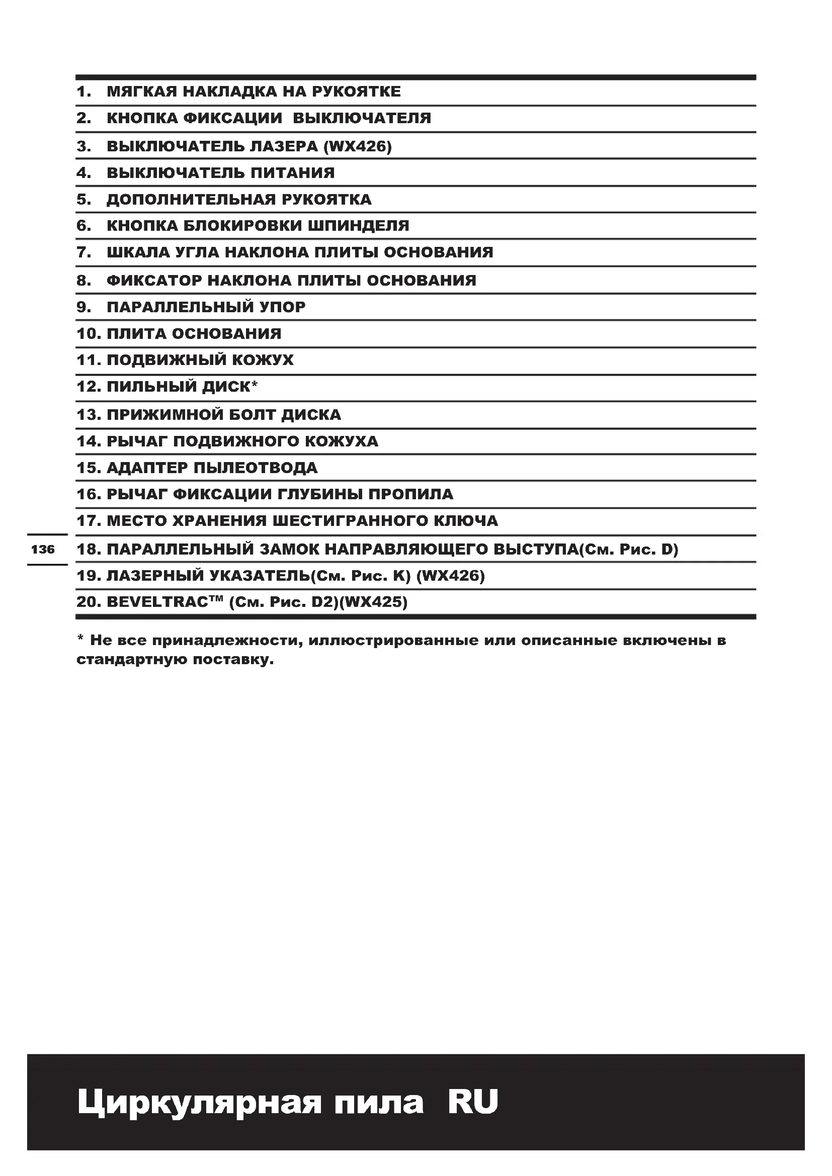 - Не все принадлежности, иллюстрированные или описанные включены в стандартную поставку.Циркулярная пила RU