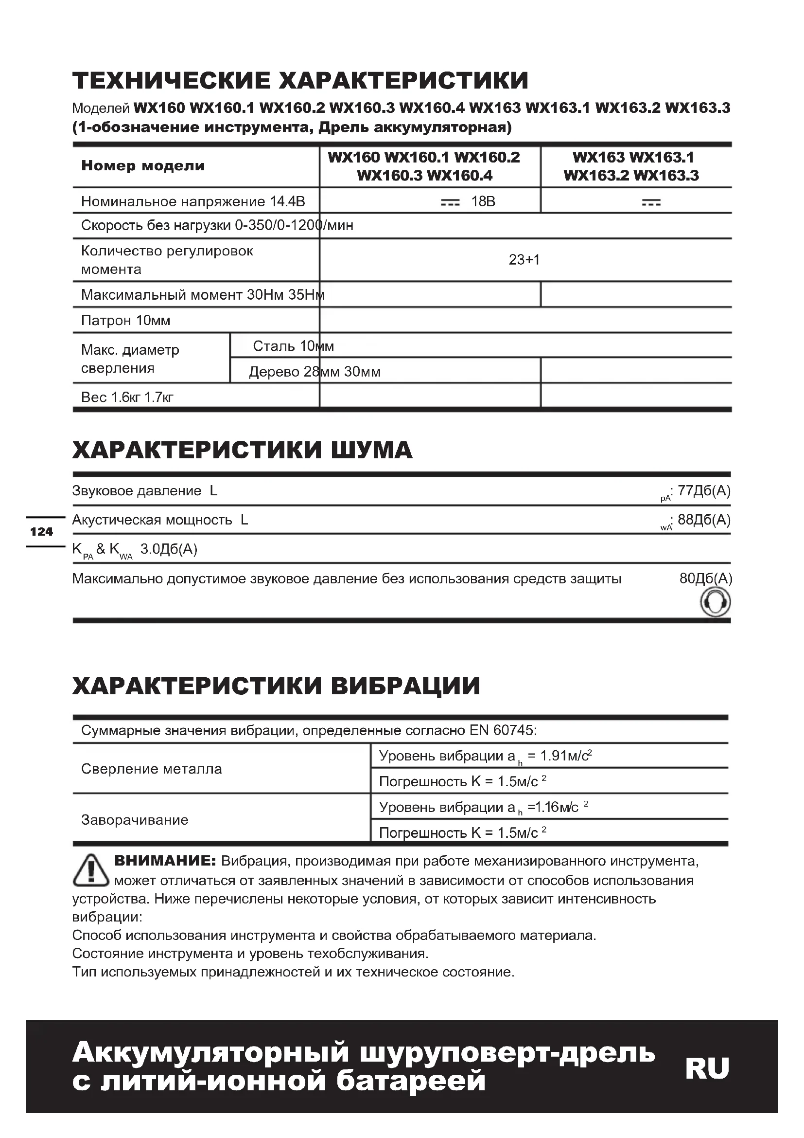 WX160 WX160.1 WX160.2 WX160.3 WX160.4 WX163 WX163.1 WX163.2 WX163.3 Номинальное напряжение 14.4В 18В Скорость без нагрузки 0-350/0-1200/мин Количество регулировок