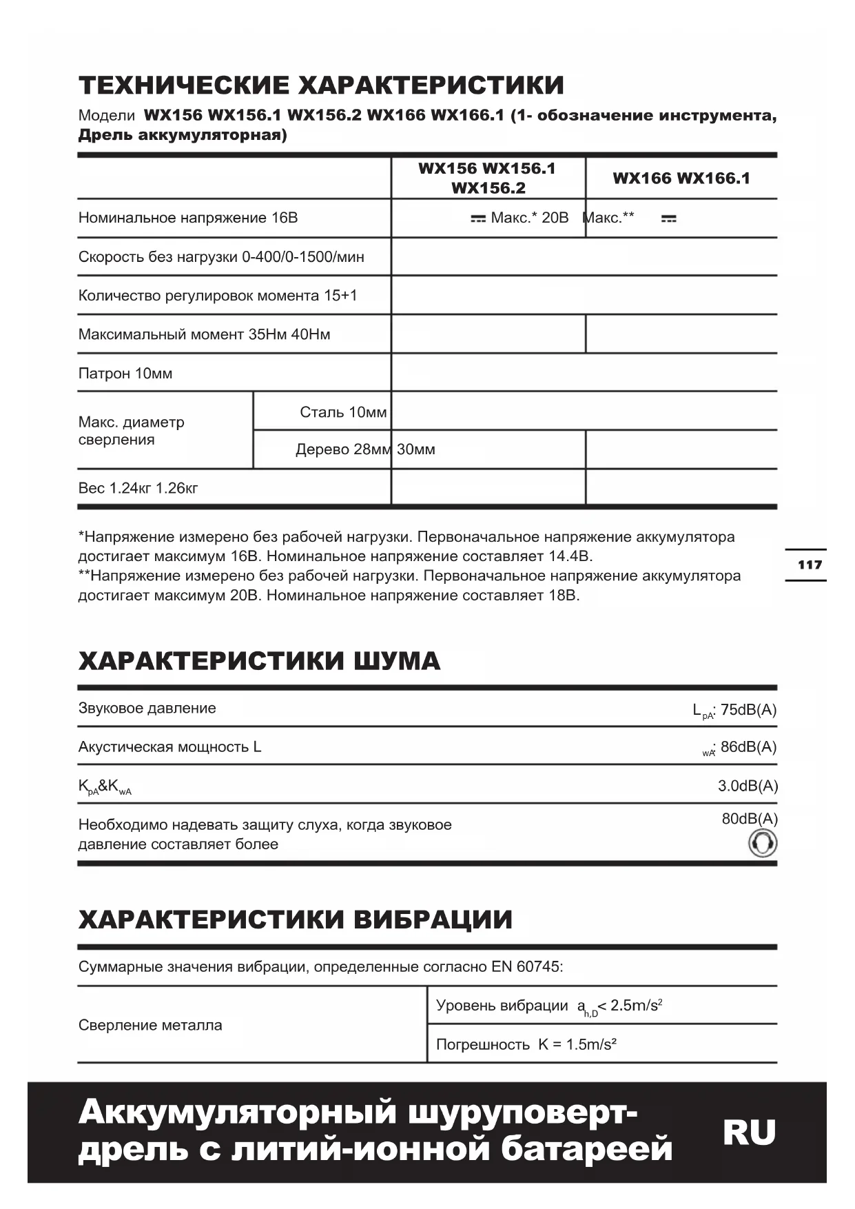 WX156 WX156.1 WX156.2 WX166 WX166.1 Номинальное напряжение 16В Макс.* 20В Макс.** Скорость без нагрузки 0-400/0-1500/мин Количество регулировок момента 15+1 Максимальный момент 35Нм 40Нм Патрон 10мм Макс. диаметр