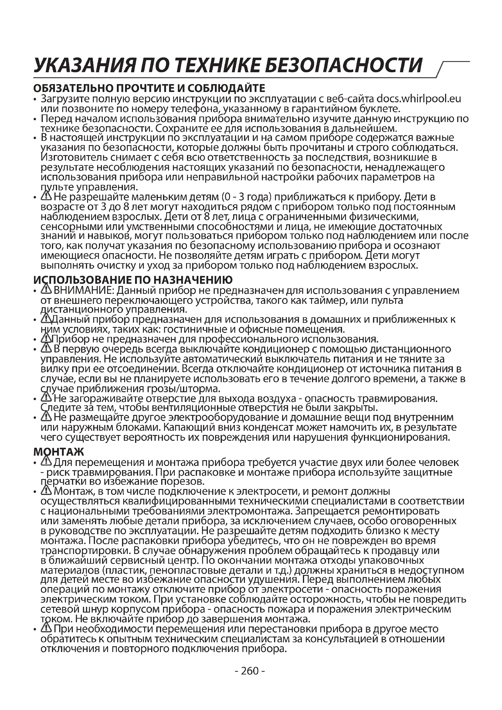 При необходимости перемещения или перестановки прибора в другое место обратитесь к опытным техническим специалистам за консультацией в отношении отключения и повторного подключения прибора. УКАЗАНИЯ ПО ТЕХНИКЕ БЕЗОПАСНОСТИ- 261 -