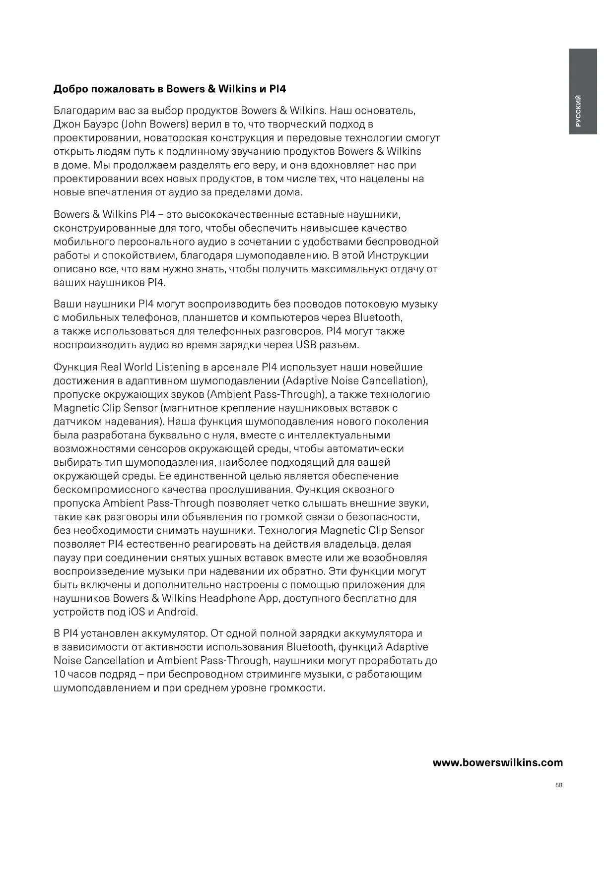 www.bowerswilkins.com Добро пожаловать в Bowers & Wilkins и PI4 Благодарим вас за выбор продуктов Bowers & Wilkins. Наш основатель, Джон Бауэрс (John Bowers) верил в то, что творческий подход в проектировании, новаторская конструкция и передовые технологии смогут открыть людям путь к подлинному звучанию продуктов Bowers & Wilkins в доме. Мы продолжаем разделять его веру, и она вдохновляет нас при проектировании всех новых продуктов, в том числе тех, что нацелены на новые впечатления от аудио за пределами дома. Bowers & Wilkins PI4 – это высококачественные вставные наушники, сконструированные для того, чтобы обеспечить наивысшее качество мобильного персонального аудио в сочетании с удобствами беспроводной работы и спокойствием, благодаря шумоподавлению. В этой Инструкции описано все, что вам нужно знать, чтобы получить максимальную отдачу от ваших наушников PI4. Ваши наушники PI4 могут воспроизводить без проводов потоковую музыку с мобильных телефонов, планшетов и компьютеров через Bluetooth, а также использоваться для телефонных разговоров. PI4 могут также воспроизводить аудио во время зарядки через USB разъем. Функция Real World Listening в арсенале PI4 использует наши новейшие достижения в адаптивном шумоподавлении (Adaptive Noise Cancellation), пропуске окружающих звуков (Ambient Pass-Through), а также технологию Magnetic Clip Sensor (магнитное крепление наушниковых вставок с датчиком надевания). Наша функция шумоподавления нового поколения была разработана буквально с нуля, вместе с интеллектуальными возможностями сенсоров окружающей среды, чтобы автоматически выбирать тип шумоподавления, наиболее подходящий для вашей окружающей среды. Ее единственной целью является обеспечение бескомпромиссного качества прослушивания. Функция сквозного пропуска Ambient Pass-Through позволяет четко слышать внешние звуки, такие как разговоры или объявления по громкой связи о безопасности, без необходимости снимать наушники. Технология Magnetic Clip Sensor позволяет PI4 естественно реагировать на действия владельца, делая паузу при соединении снятых ушных вставок вместе или же возобновляя воспроизведение музыки при надевании их обратно. Эти функции могут быть включены и дополнительно настроены с помощью приложения для наушников Bowers & Wilkins Headphone App, доступного бесплатно для устройств под iOS и Android. В PI4 установлен аккумулятор. От одной полной зарядки аккумулятора и в зависимости от активности использования Bluetooth, функций Adaptive Noise Cancellation и Ambient Pass-Through, наушники могут проработать до 10 часов подряд – при беспроводном стриминге музыки, с работающим шумоподавлением и при среднем уровне громкости.