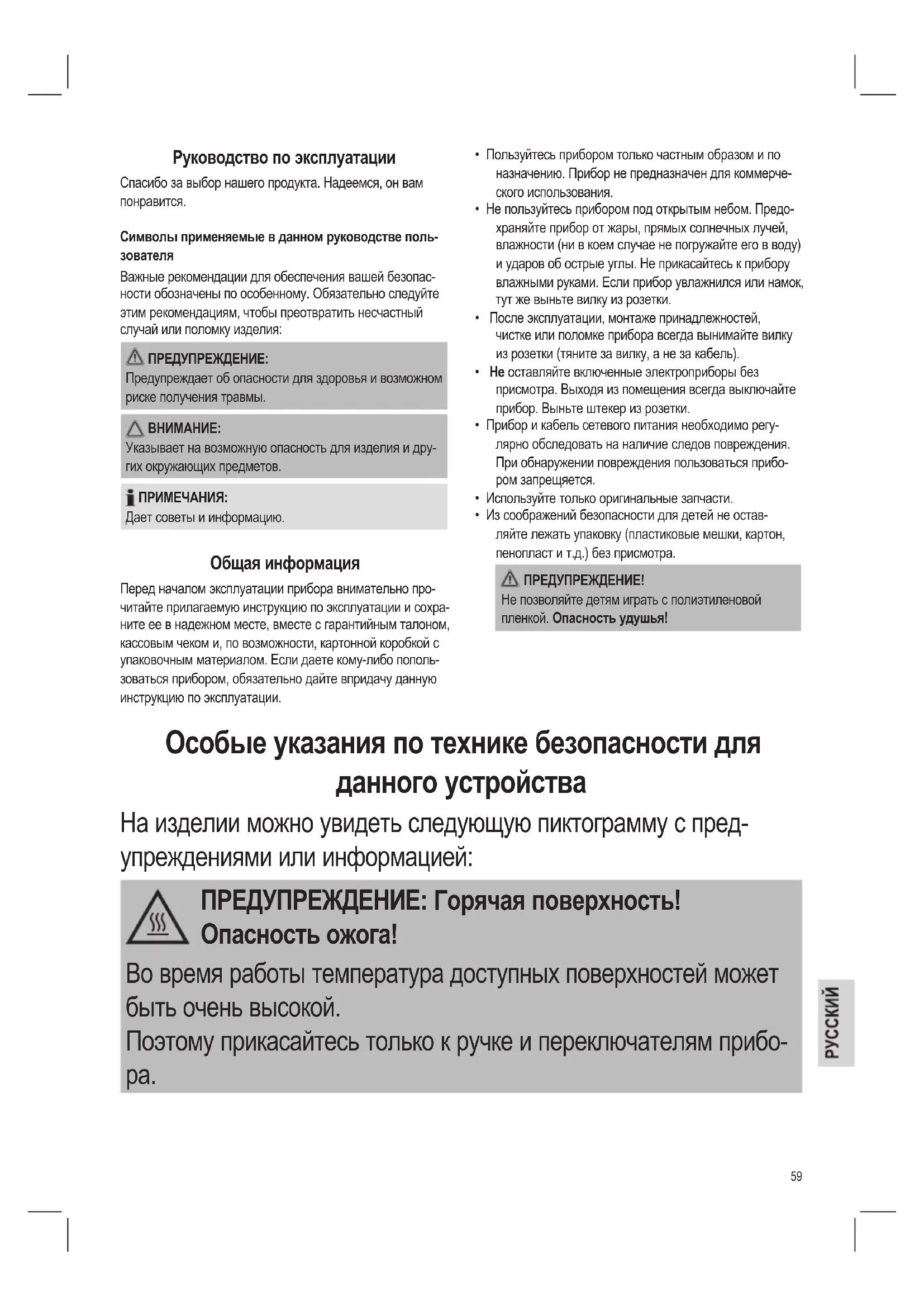 Указывает на возможную опасность для изделия и дру- гих окружающих предметов. ПРИМЕЧАНИЯ: Дает советы и информацию. Общая информация Перед началом эксплуатации прибора внимательно про- читайте прилагаемую инструкцию по эксплуатации и сохра- ните ее в надежном месте, вместе с гарантийным талоном, кассовым чеком и, по возможности, картонной коробкой с упаковочным материалом. Если даете кому-либо пополь- зоваться прибором, обязательно дайте впридачу данную инструкцию по эксплуатации. Особые указания по технике безопасности для данного устройства На изделии можно увидеть следующую пиктограмму с пред- упреждениями или информацией: ПРЕДУПРЕЖДЕНИЕ: Горячая поверхность! Опасность ожога! Во время работы температура доступных поверхностей может быть очень высокой. Поэтому прикасайтесь только к ручке и переключателям прибо- ра.60 ПРЕДУПРЕЖДЕНИЕ: Риск ожога! Горячий пар будет выходить во время процесса готовки и при открытии верхней крышки гриля. ВНИМАНИЕ: Опасность пожара! Масло и жир могут загореться при перегревании. Соблюдайте достаточное расстояние (30 см) до легко воспламеняющихся предметов, таких как мебель, шторы и т.п.