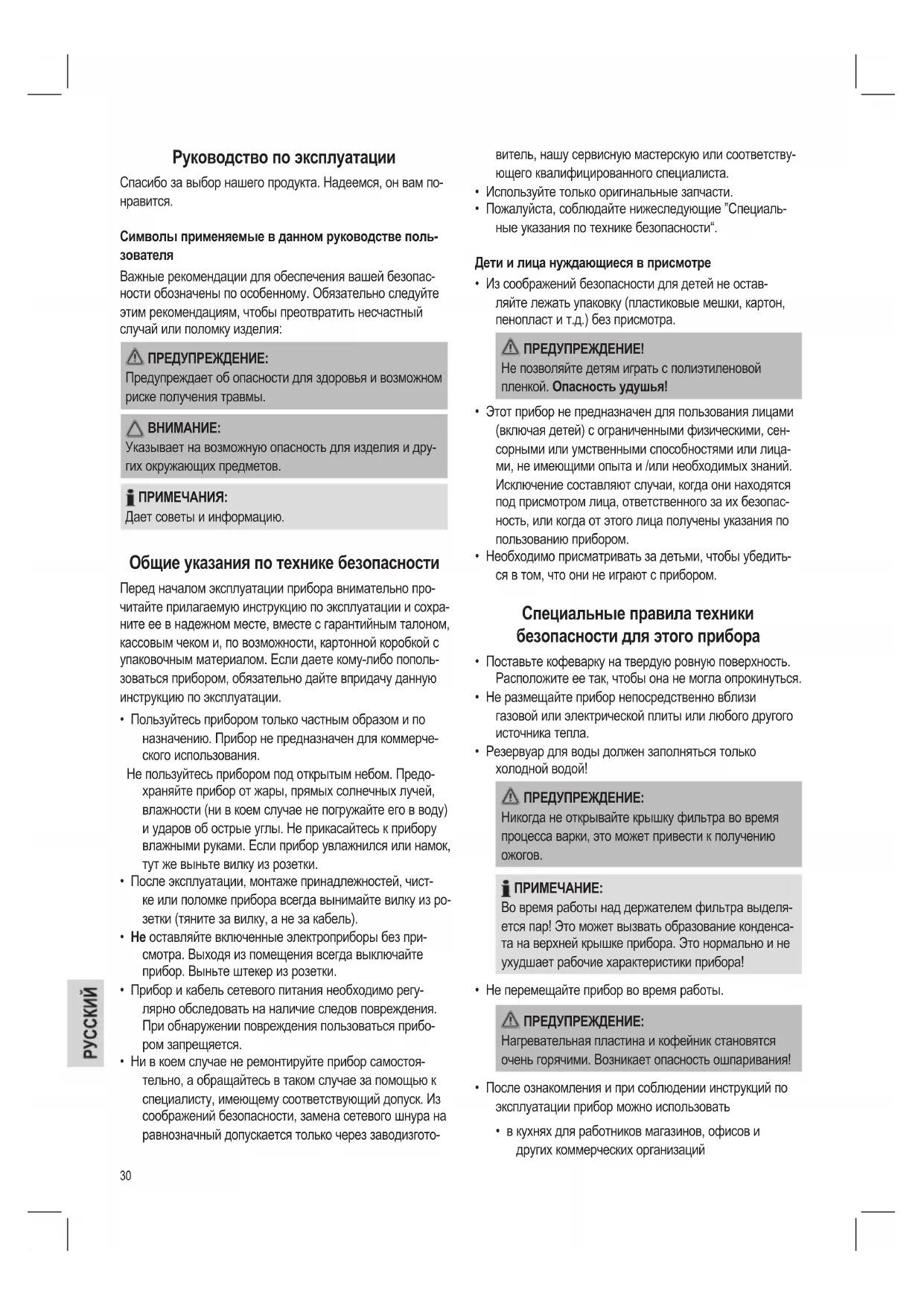 Указывает на возможную опасность для изделия и дру- гих окружающих предметов. ПРИМЕЧАНИЯ: Дает советы и информацию. Общие указания по технике безопасности Перед началом эксплуатации прибора внимательно про- читайте прилагаемую инструкцию по эксплуатации и сохра- ните ее в надежном месте, вместе с гарантийным талоном, кассовым чеком и, по возможности, картонной коробкой с упаковочным материалом. Если даете кому-либо пополь- зоваться прибором, обязательно дайте впридачу данную инструкцию по эксплуатации.