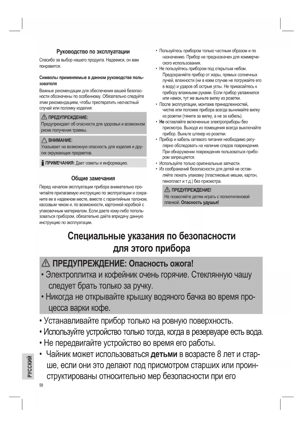 Указывает на возможную опасность для изделия и дру- гих окружающих предметов. ПРИМЕЧАНИЯ: Дает советы и информацию. Общие замечания Перед началом эксплуатации прибора внимательно про- читайте прилагаемую инструкцию по эксплуатации и сохра- ните ее в надежном месте, вместе с гарантийным талоном, кассовым чеком и, по возможности, картонной коробкой с упаковочным материалом. Если даете кому-либо пополь- зоваться прибором, обязательно дайте впридачу данную инструкцию по эксплуатации. Специальные указания по безопасности для этого прибора ПРЕДУПРЕЖДЕНИЕ: Опасность ожога!
