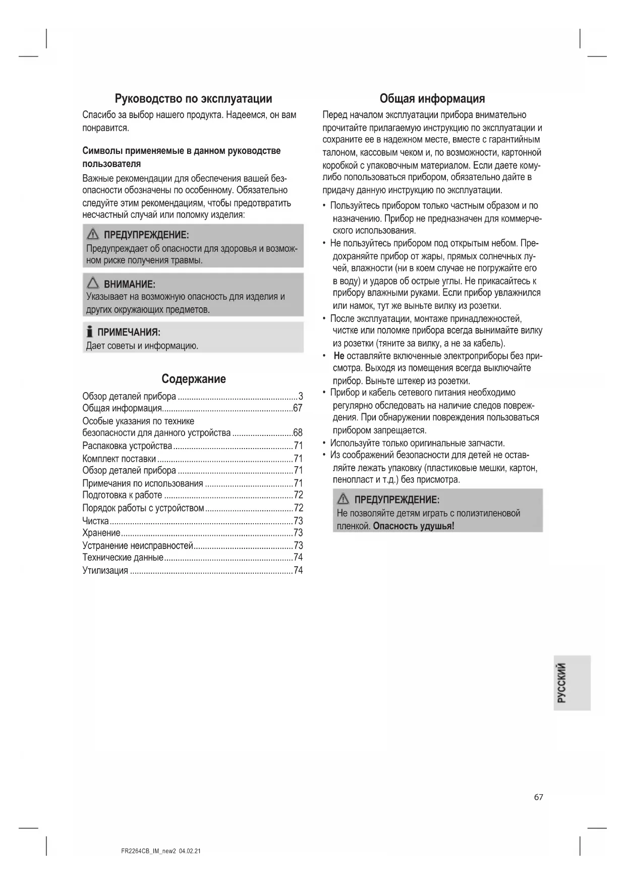 - Из соображений безопасности для детей не остав- ляйте лежать упаковку (пластиковые мешки, картон, пенопласт и т.д.) без присмотра. ПРЕДУПРЕЖДЕНИЕ: Не позволяйте детям играть с полиэтиленовой пленкой. Опасность удушья!FR2264CB_IM_new2 04.02.21