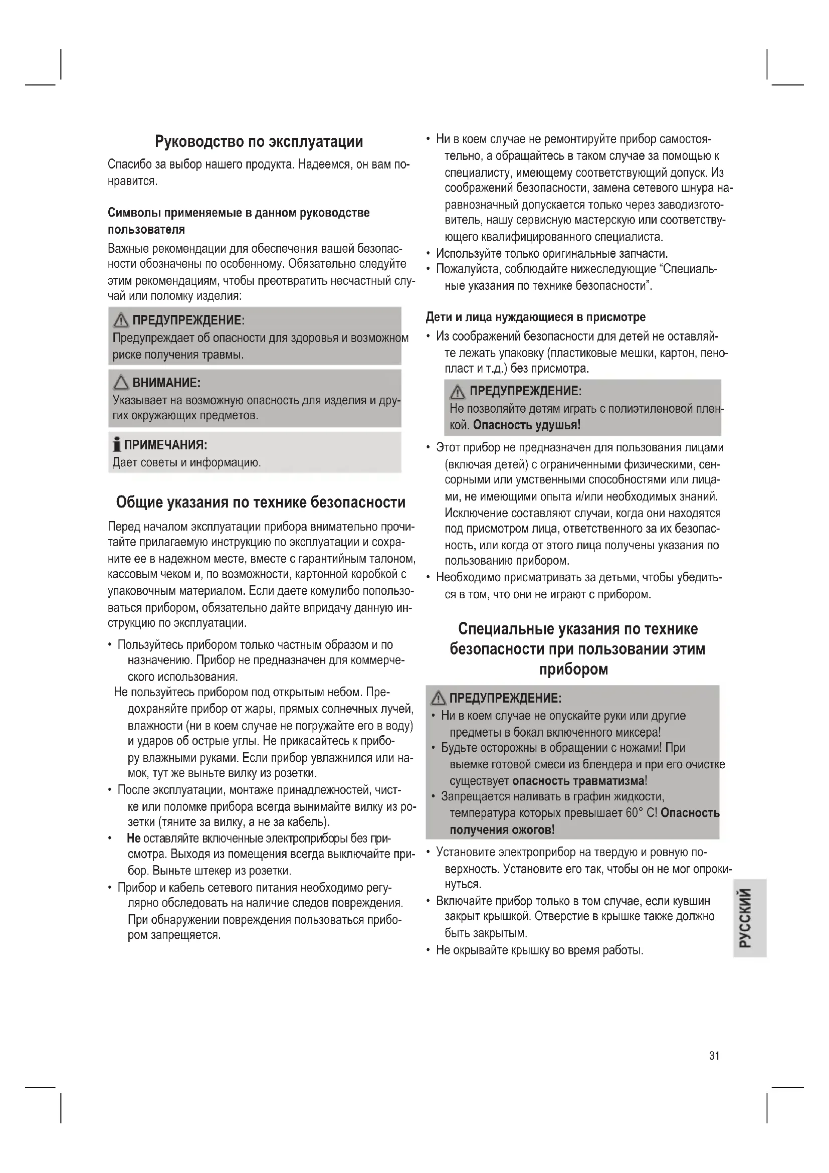 - Будьте осторожны в обращении с ножами! При выемке готовой смеси из блендера и при его очистке существует опасность травматизма!