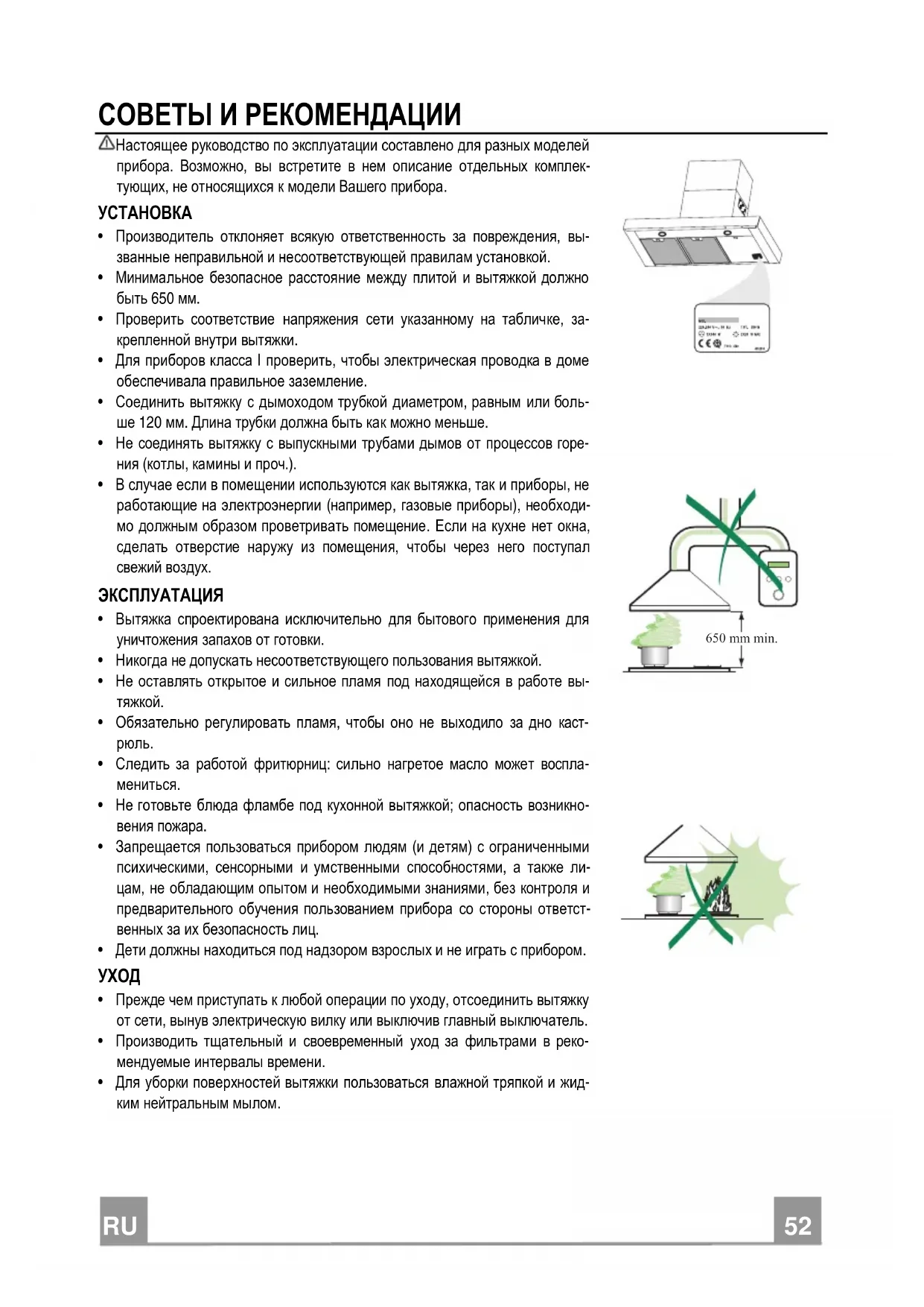 - Не соединять вытяжку с выпускными трубами дымов от процессов горе- ния (котлы, камины и проч.).