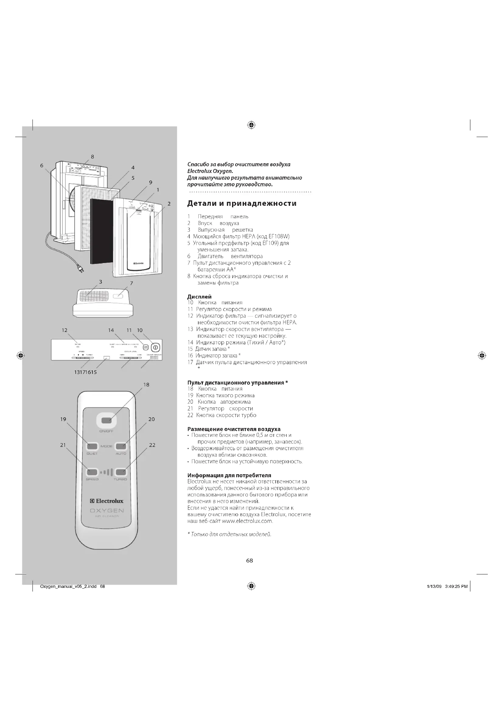 Oxygen_manual_v05_2.indd 67Oxygen_manual_v05_2.indd 67 1/13/09 3:49:25 PM1/13/09 3:49:25 PM68 Спасибо за выбор очистителя воздуха Electrolux Oxygen. Для наилучшего результата внимательно прочитайте это руководство. Детали и принадлежности 1 Передняя панель 2 Впуск воздуха 3 Выпускная решетка 4 Моющийся фильтр HEPA (код EF108W) 5 Угольный предфильтр (код EF109) для уменьшения запаха. 6 Двигатель вентилятора 7 Пульт дистанционного управления с 2 батареями AA* 8 Кнопка сброса индикатора очистки и замены фильтра