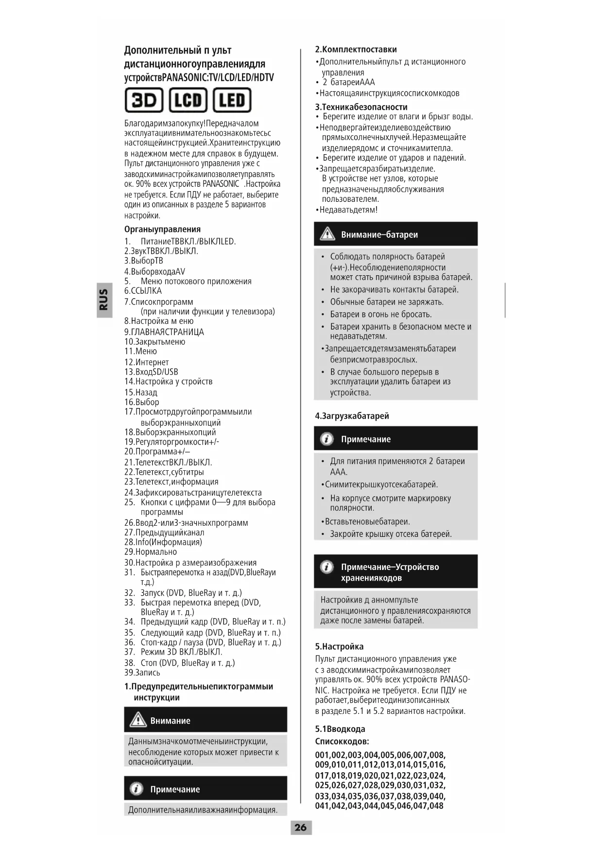 - Настоящая инструкция со списком кодов
