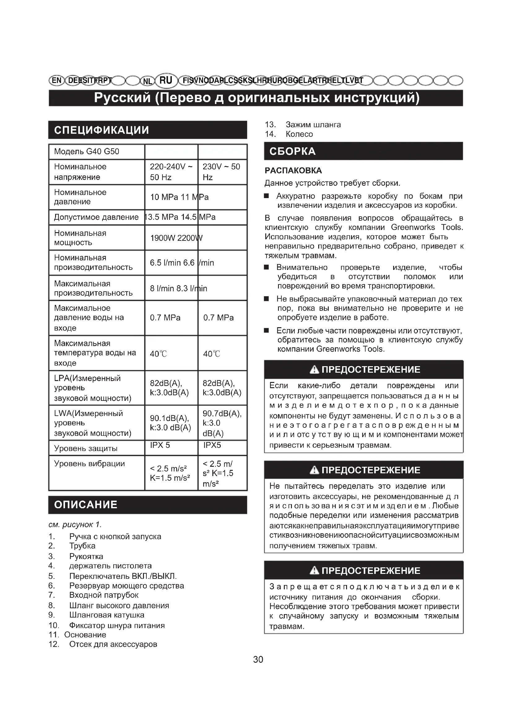 Данное устройство требует сборки. Аккуратно разрежьте коробку по бокам при извлечении изделия и аксессуаров из коробки. В случае появления вопросов обращайтесь в клиентскую службу компании Greenworks Tools. Использование изделия, которое может быть неправильно предварительно собрано, приведет к тяжелым травмам. Внимательно проверьте изделие, чтобы убедиться в отсутствии поломок или повреждений во время транспортировки. Не выбрасывайте упаковочный материал до тех пор, пока вы внимательно не проверите и не опробуете изделие в работе. Если любые части повреждены или отсутствуют, обратитесь за помощью в клиентскую службу компании Greenworks Tools. ПРЕДОСТЕРЕЖЕНИЕ Если какие-либо детали повреждены или отсутствуют, запрещается пользоваться д а н н ы м и з д е л и е м д о т е х п о р , п о к а данные компоненты не будут заменены. И с п о л ь з о в а н и е э т о г о а г р е г а т а с п о в р еж д е н н ы м и и л и отс у тс т ву ю щ и м и компонентами может привести к серьезным травмам. ПРЕДОСТЕРЕЖЕНИЕ Не пытайтесь переделать это изделие или изготовить аксессуары, не рекомендованные д л я и с п ол ь зо ва н и я с эт и м и зд ел и е м . Любые подобные переделки или изменения рассматрив аютсякакнеправильнаяэксплуатацияимогутприве стиквозникновениюопаснойситуациисвозможным получением тяжелых травм. ПРЕДОСТЕРЕЖЕНИЕ З а п р е щ а ет с я п о д к л ю ч а т ь и з д ел и е к источнику питания до окончания сборки. Несоблюдение этого требования может привести к случайному запуску и возможным тяжелым травмам.Русский (Перево д оригинальных инструкций)