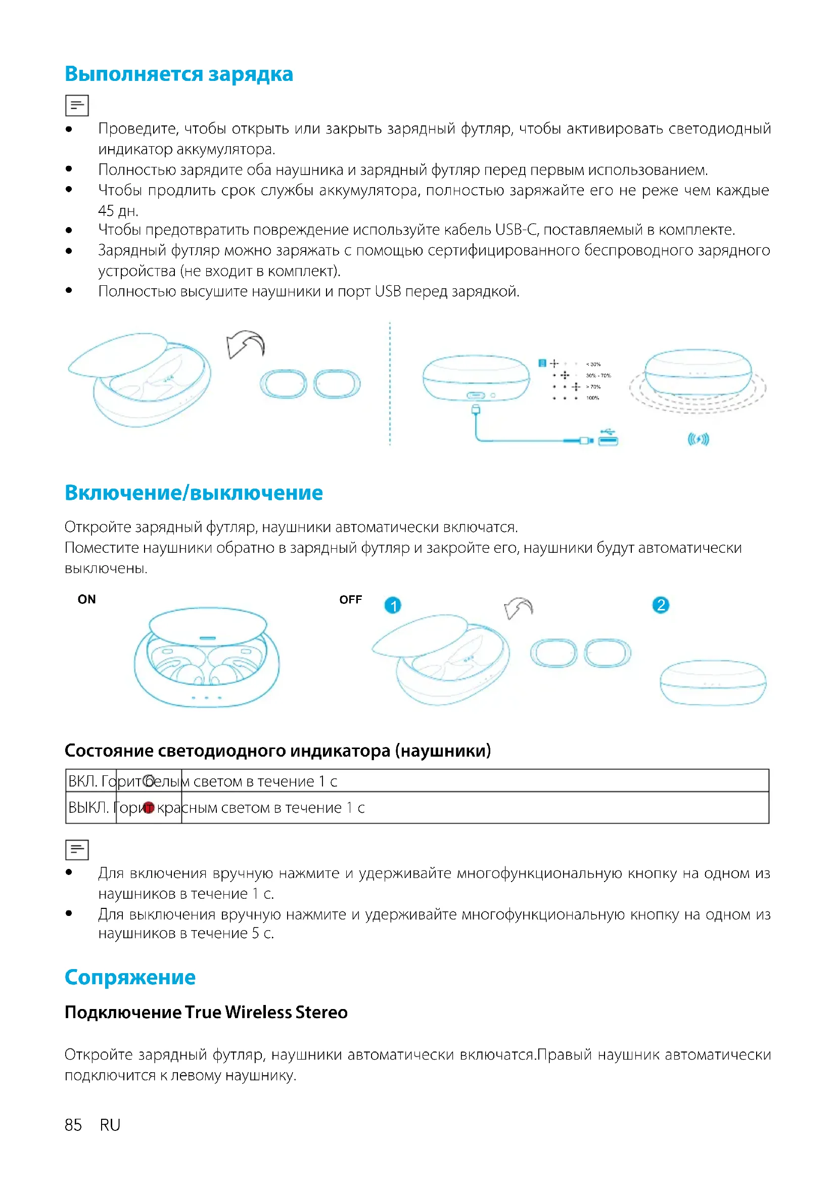Полностью высушите наушники и порт USB перед зарядкой. < 30%30% - 70%> 70% 100% Включение/выключение Откройте зарядный футляр, наушники автоматически включатся. Поместите наушники обратно в зарядный футляр и закройте его, наушники будут автоматически