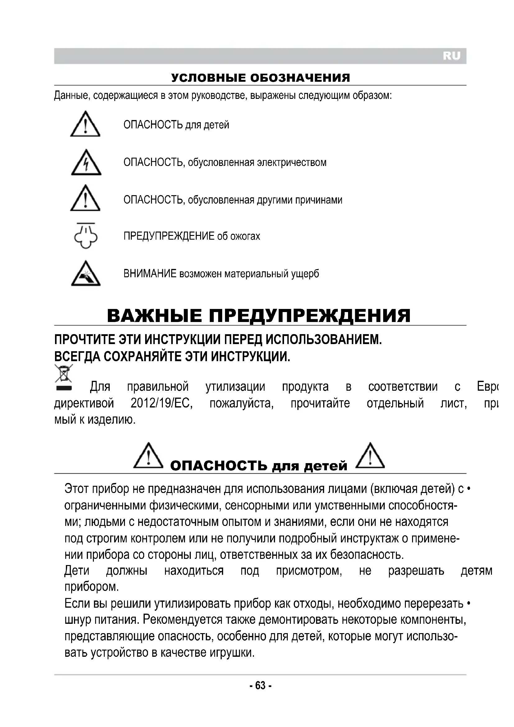 УСЛОВНЫЕ ОБОЗНАЧЕНИЯ Данные,содержащиесявэтомруководстве,выраженыследующимобразом: ОПАСНОСТЬдлядетей ОПАСНОСТЬ,обусловленнаяэлектричеством ОПАСНОСТЬ,обусловленнаядругимипричинами ПРЕДУПРЕЖДЕНИЕобожогах ВНИМАНИЕвозможенматериальныйущерб ВАЖНЫЕ ПРЕДУПРЕЖДЕНИЯ ПРоЧТИТЕ ЭТИ ИНСТРУКЦИИ ПЕРЕД ИСПоЛЬЗоВАНИЕМ. ВСЕГДА СоХРАНЯЙТЕ ЭТИ ИНСТРУКЦИИ. Для правильной утилизации продукта в соответствии с Европейской директивой 2012/19/EC, пожалуйста, прочитайте отдельный лист, прилагае- мыйкизделию. ОПАСНОСТЬ для детей Этотприборнепредназначендляиспользованиялицами(включаядетей)с• ограниченнымифизическими,сенсорнымиилиумственнымиспособностя- ми;людьмиснедостаточнымопытомизнаниями,еслиониненаходятся подстрогимконтролемилинеполучилиподробныйинструктажопримене- нииприборасосторонылиц,ответственныхзаихбезопасность. Дети должны находиться под присмотром, не разрешать детям играть с•