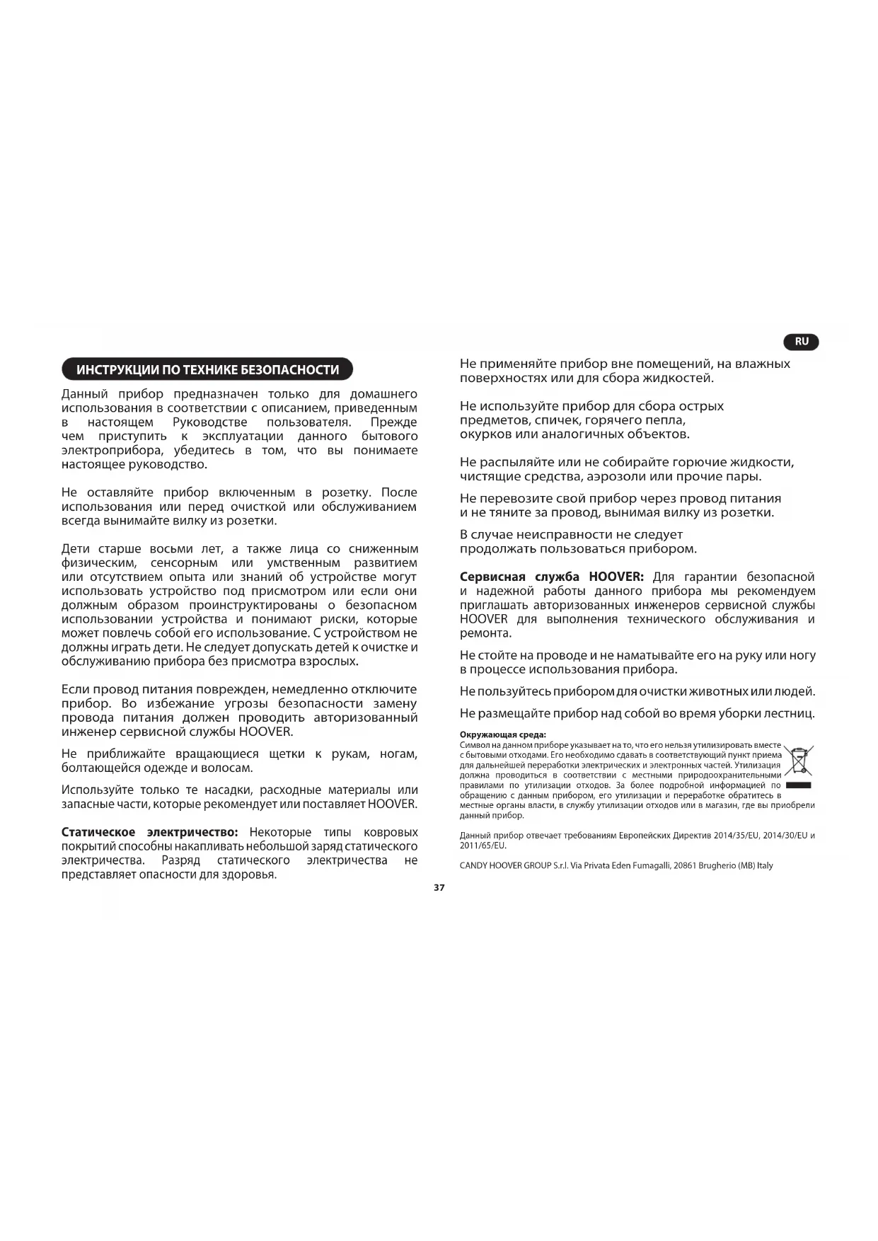 ИНСТРУКЦИИ ПО ТЕХНИКЕ БЕЗОПАСНОСТИ Данный прибор предназначен только для домашнего использования в соответствии с описанием, приведенным в настоящем Руководстве пользователя. Прежде чем приступить к эксплуатации данного бытового электроприбора, убедитесь в том, что вы понимаете настоящее руководство. Не оставляйте прибор включенным в розетку. После использования или перед очисткой или обслуживанием всегда вынимайте вилку из розетки. Дети старше восьми лет, а также лица со сниженным физическим, сенсорным или умственным развитием или отсутствием опыта или знаний об устройстве могут использовать устройство под присмотром или если они должным образом проинструктированы о безопасном использовании устройства и понимают риски, которые может повлечь собой его использование. С устройством не должны играть дети. Не следует допускать детей к очистке и обслуживанию прибора без присмотра взрослых. Если провод питания поврежден, немедленно отключите прибор. Во избежание угрозы безопасности замену провода питания должен проводить авторизованный инженер сервисной службы HOOVER. Не приближайте вращающиеся щетки к рукам, ногам, болтающейся одежде и волосам. Используйте только те насадки, расходные материалы или запасные части, которые рекомендует или поставляет HOOVER. Статическое электричество: Некоторые типы ковровых покрытий способны накапливать небольшой заряд статического электричества. Разряд статического электричества не представляет опасности для здоровья. Не применяйте прибор вне помещений, на влажных поверхностях или для сбора жидкостей. Не используйте прибор для сбора острых предметов, спичек, горячего пепла, окурков или аналогичных объектов. Не распыляйте или не собирайте горючие жидкости, чистящие средства, аэрозоли или прочие пары. Не перевозите свой прибор через провод питания и не тяните за провод, вынимая вилку из розетки. В случае неисправности не следует продолжать пользоваться прибором. Сервисная служба HOOVER: Для гарантии безопасной и надежной работы данного прибора мы рекомендуем приглашать авторизованных инженеров сервисной службы HOOVER для выполнения технического обслуживания и