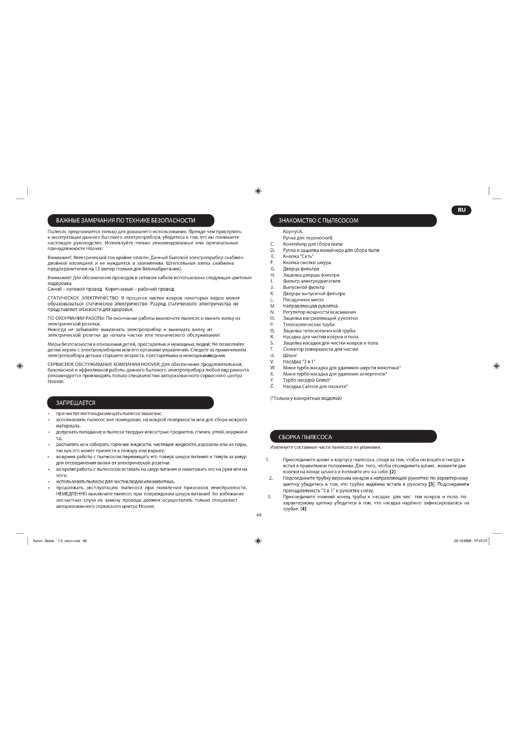 использовать пылесос для чистки людей или животных.• продолжать эксплуатацию пылесоса при появлении признаков неисправности. • НЕМЕДЛЕННО выключите пылесос при повреждении шнура питания! Во избежание несчастных случа ев замену провода должен осуществлять только специалист авторизованного сервисного центра Hoover. Xarion_Green__1-4_union.indd 49 28-10-2009 17:45:23 Дверцы выпускной фильтра Z.50