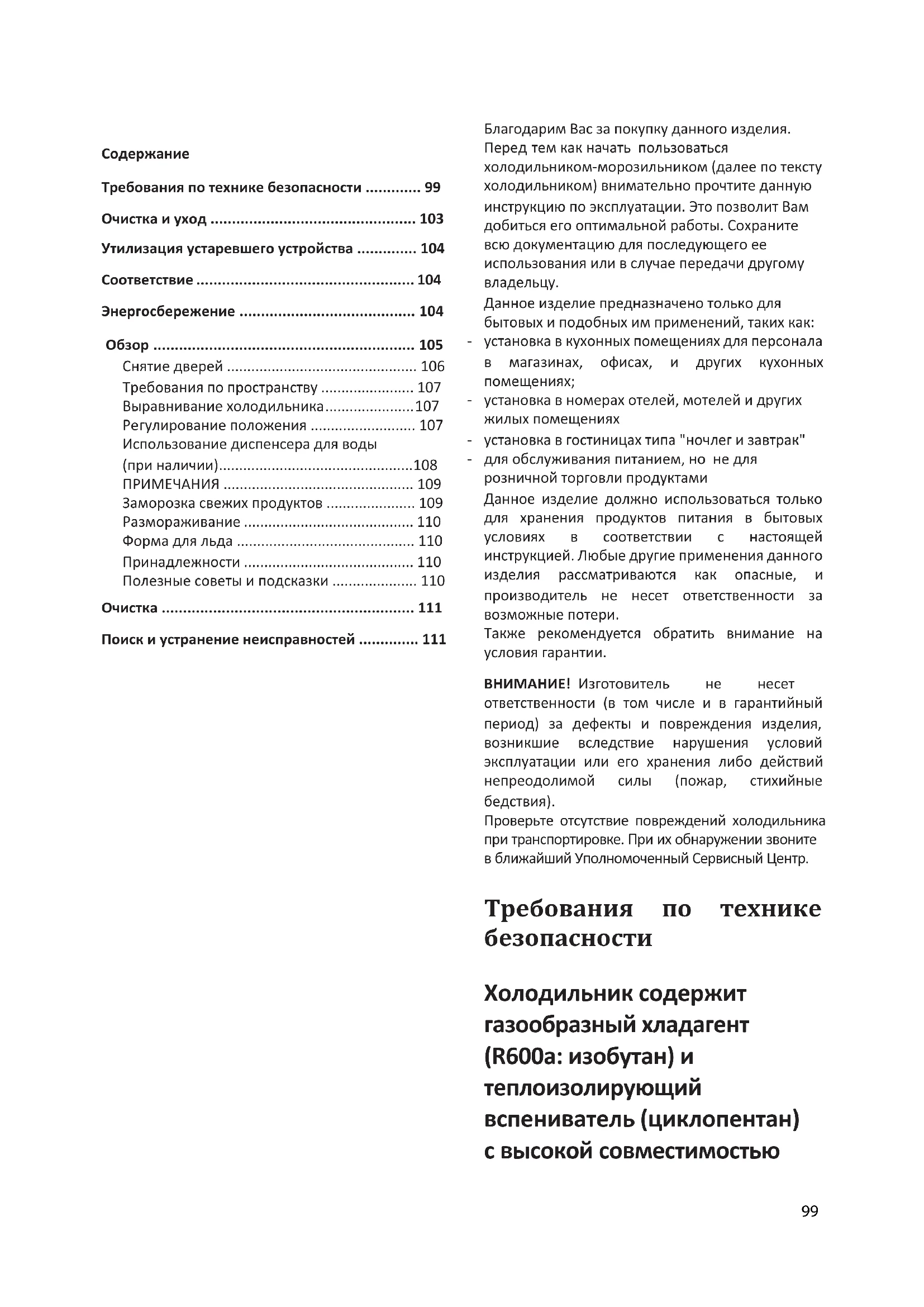 Проверьте отсутствие повреждений холодильника при транспортировке. При их обнаружении звоните в ближайший Уполномоченный Сервисный Центр. Требования по технике безопасности Холодильник содержит газообразный хладагент (R600a: изобутан) и теплоизолирующий вспениватель (циклопентан) с высокой совместимостью 99с окружающей средой, которые однако, являются горючими. Для предотвращения возникновения опасных ситуаций рекомендуется соблюдать следующие